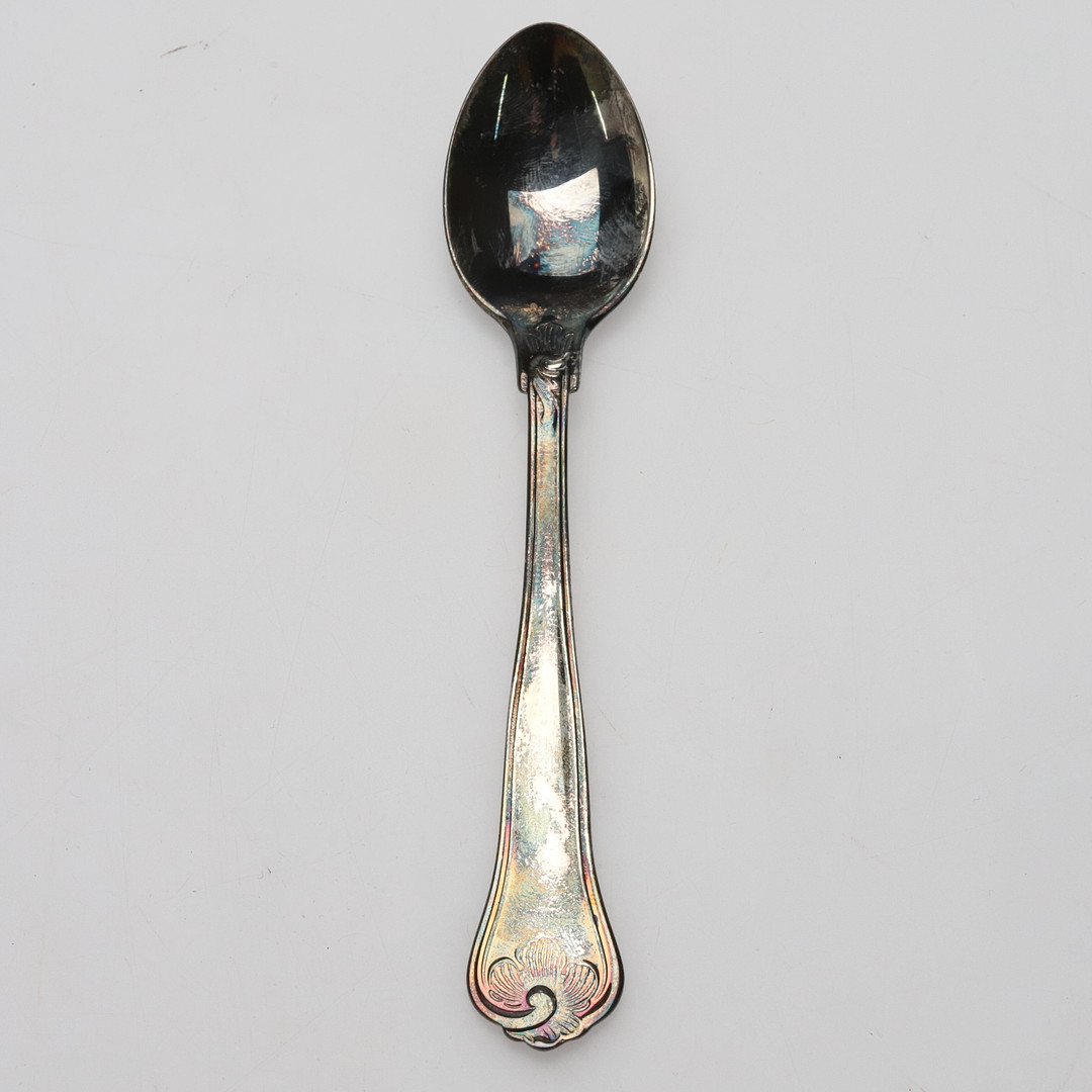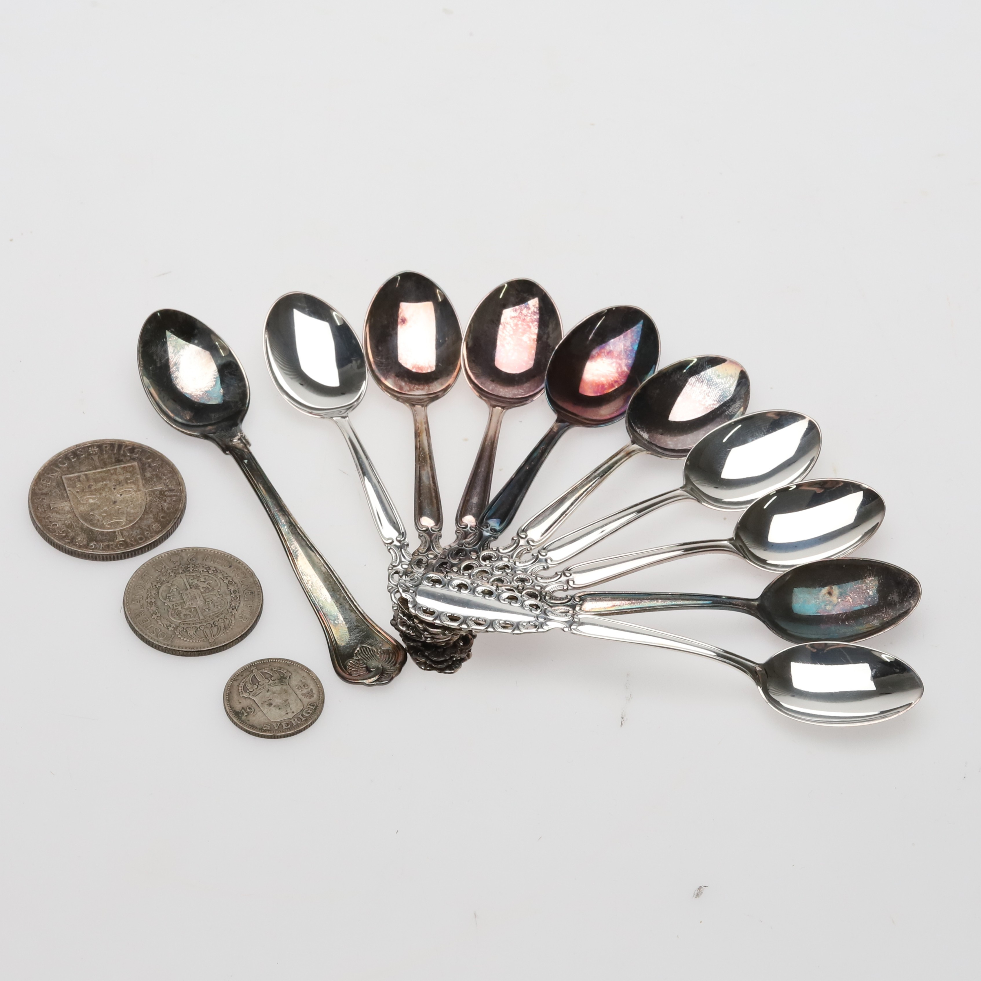 4991874. Silberne Löffel und Münzen, 157 Gramm.