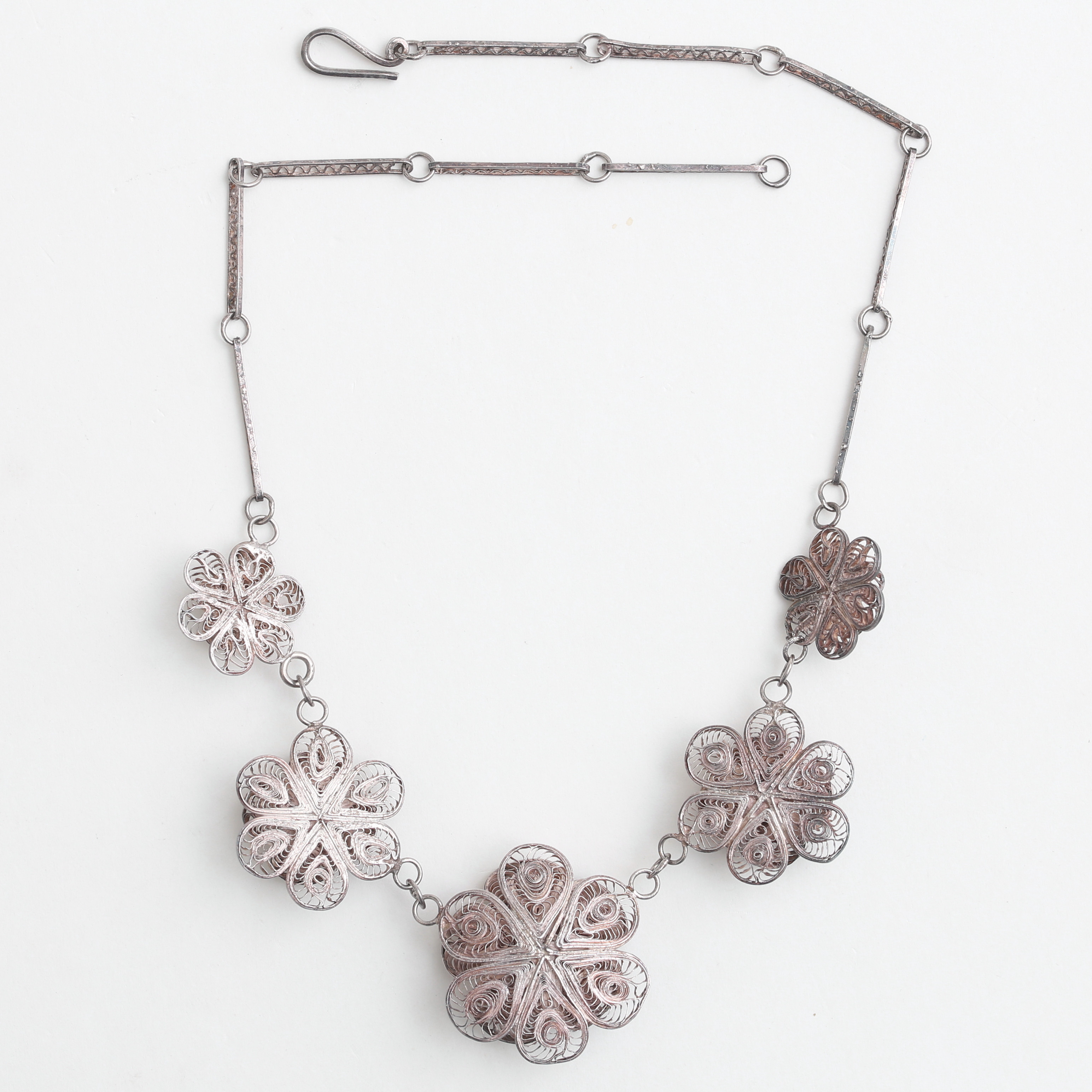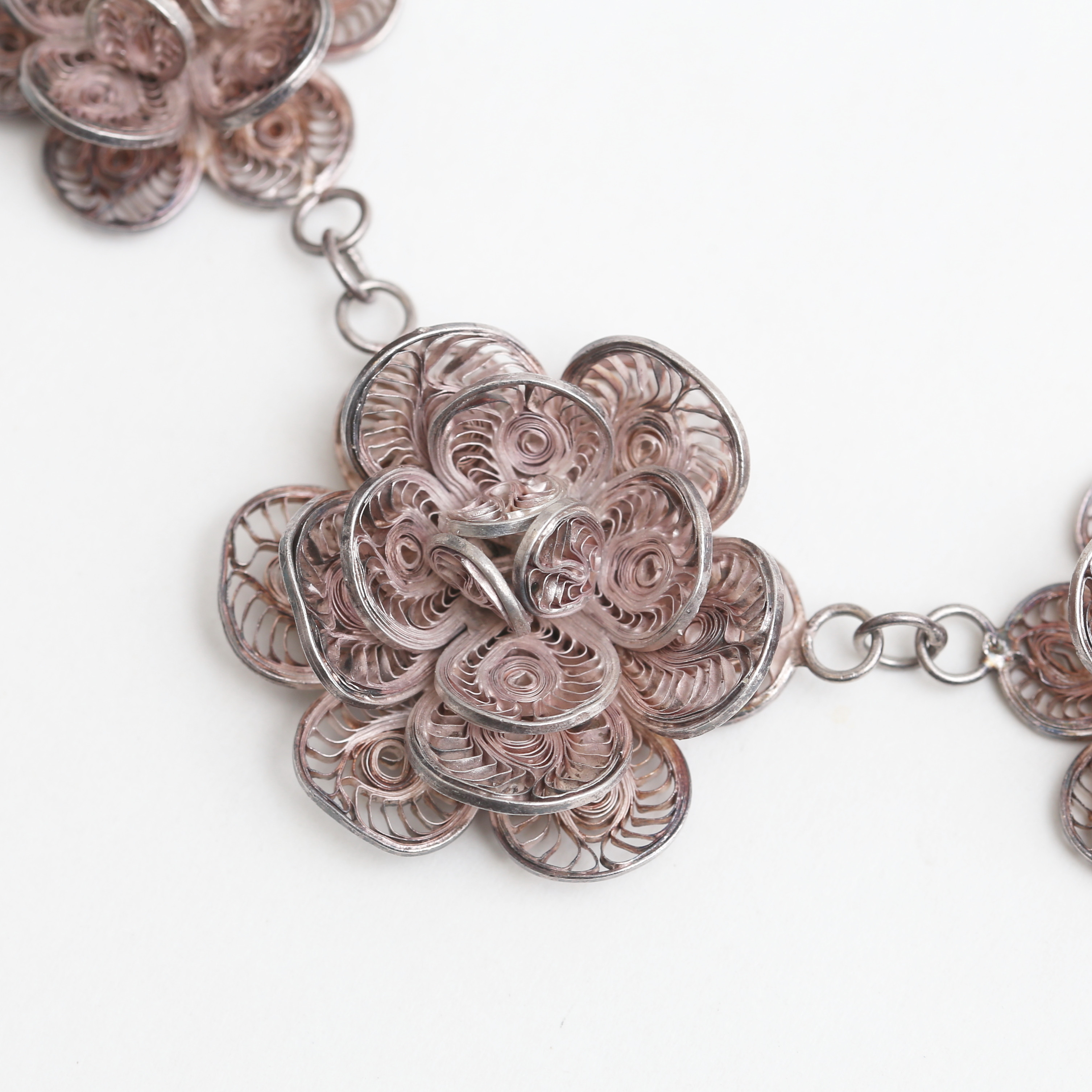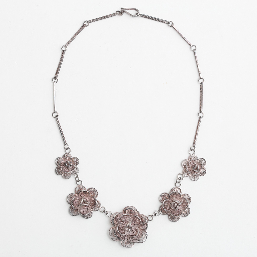 4997021. Eine filigrane/silberne Halskette in Form von Blumen.