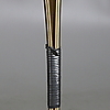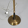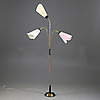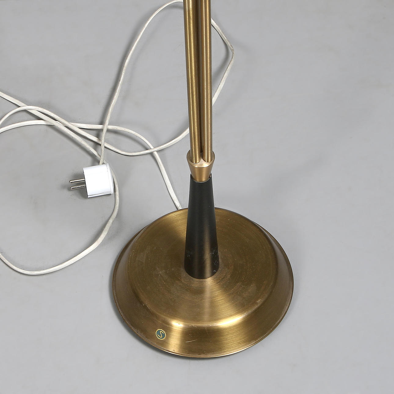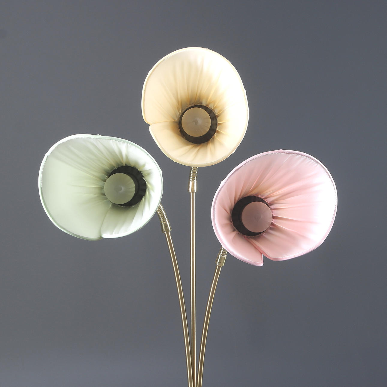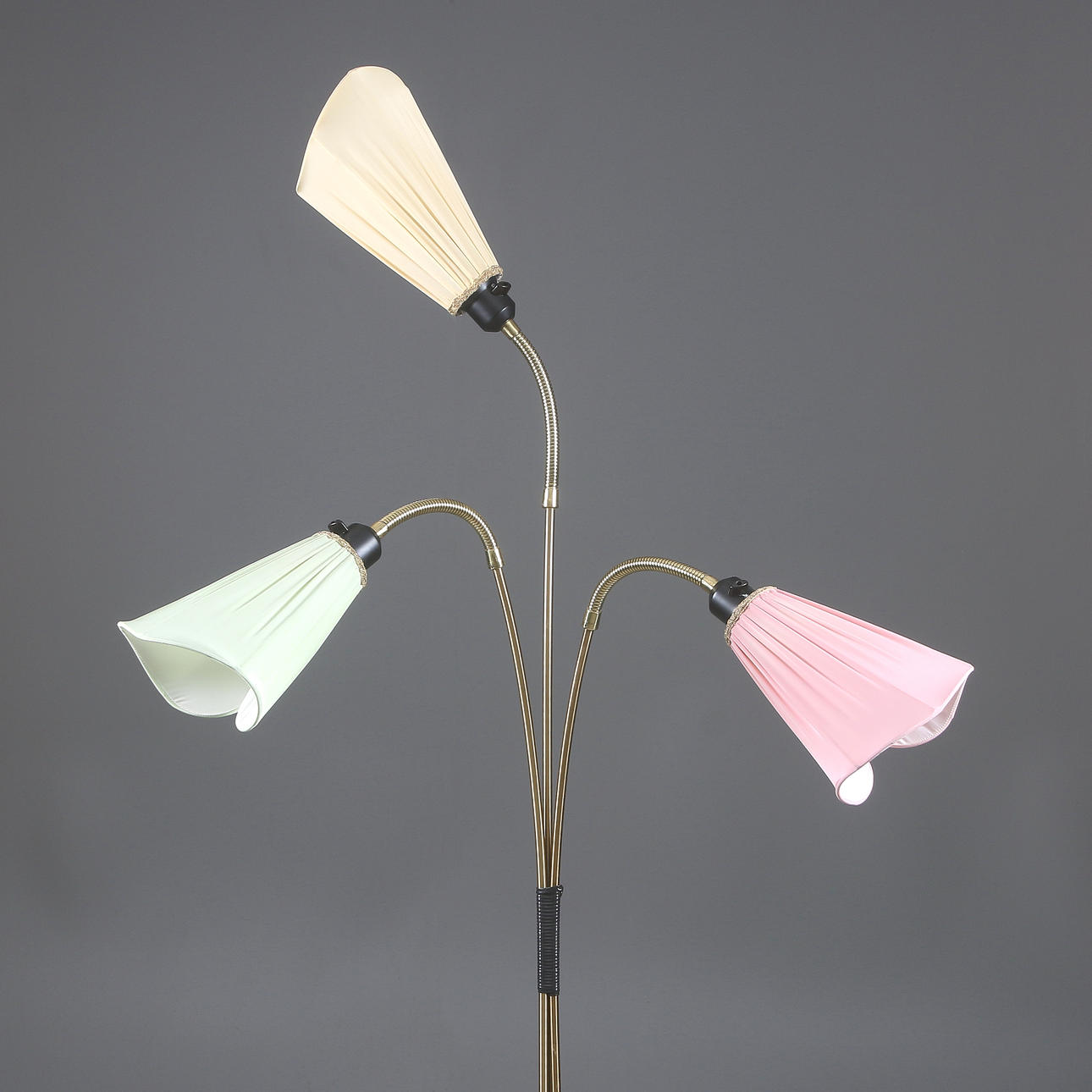 Rahmen und Fuß aus Messing mit schwarzen Details. Drei biegbare Arme mit verschiedenfarbigen Schirmen. Höhe 150 cm.
