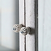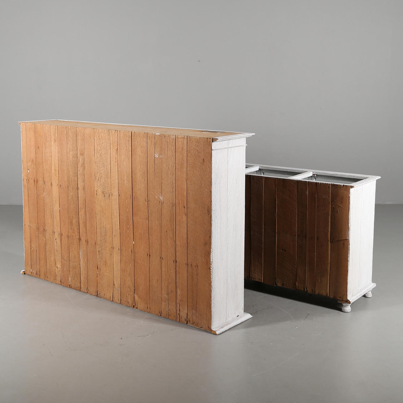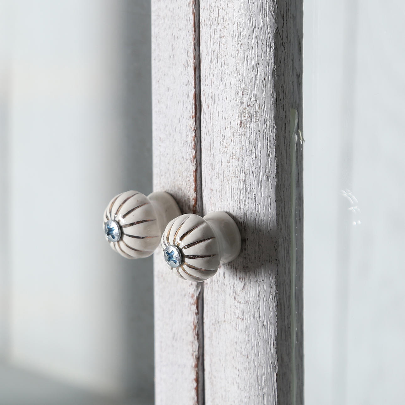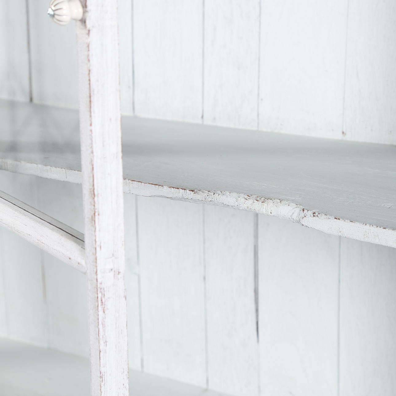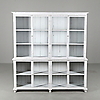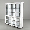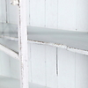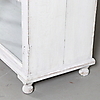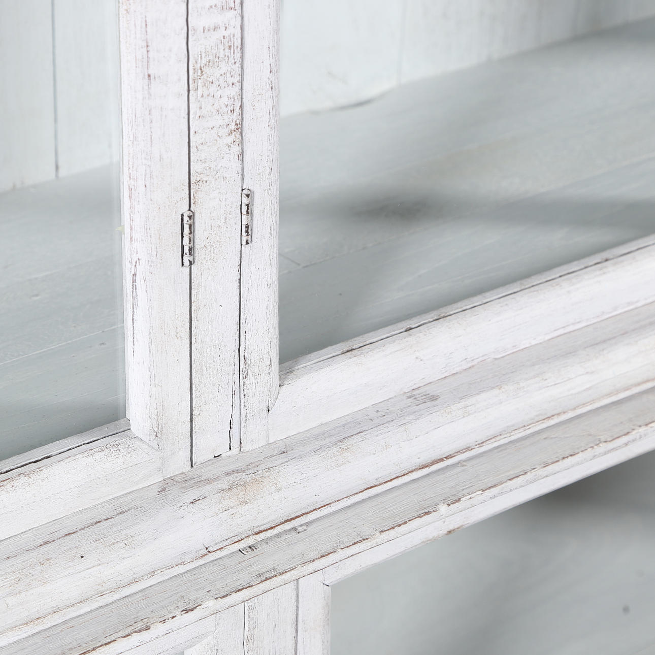 Weiß lackierte Vitrine im Kolonialstil mit Lamellenglas, unten und oben mit vier Türen mit dahinterliegendem Regal, zweiteilig, Breite 176 cm, Tiefe 54 cm, Höhe 187 cm.
