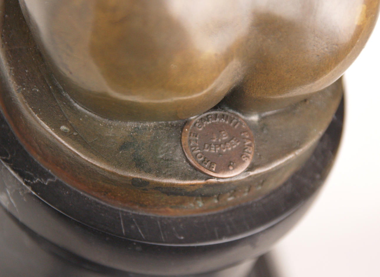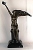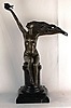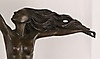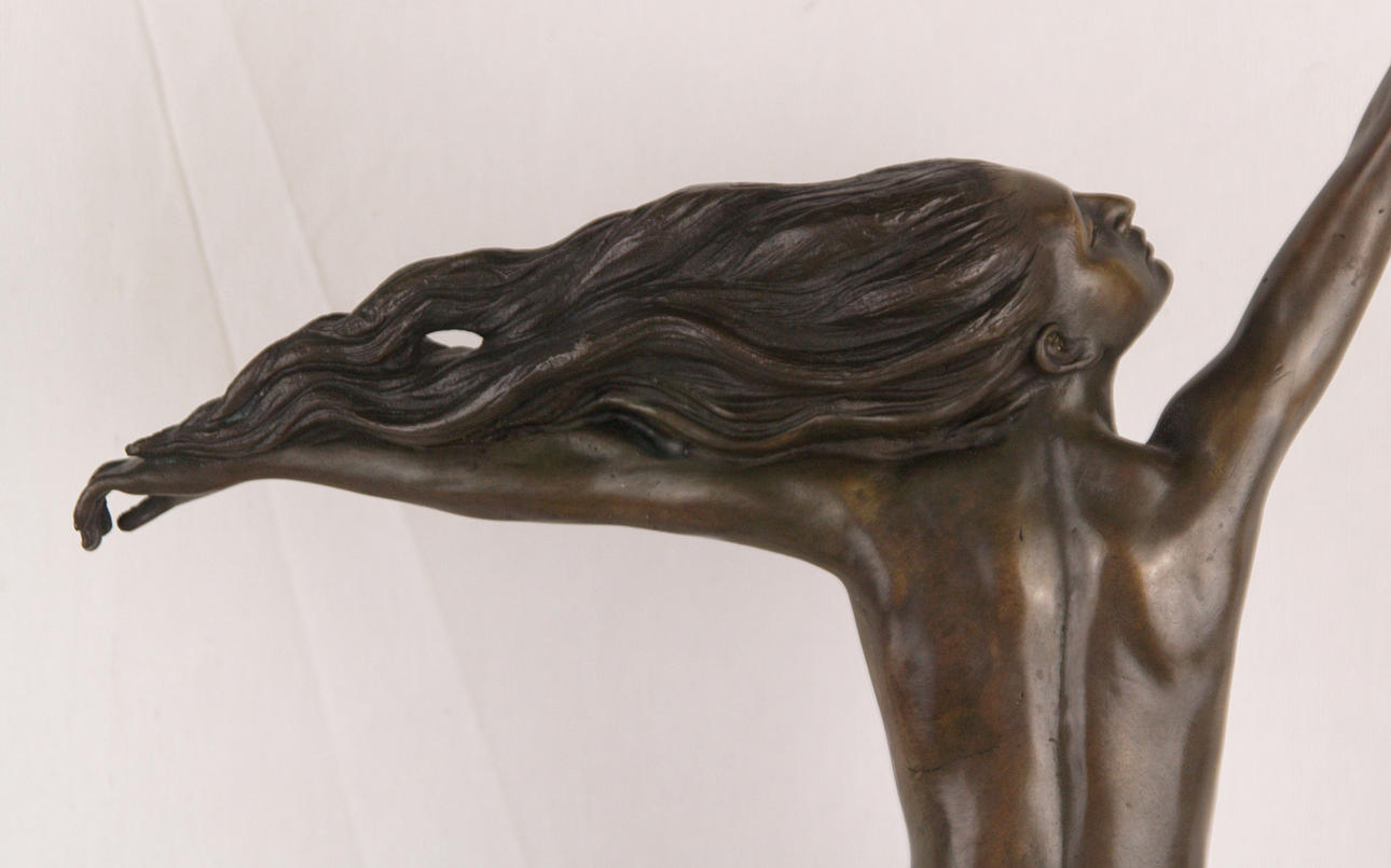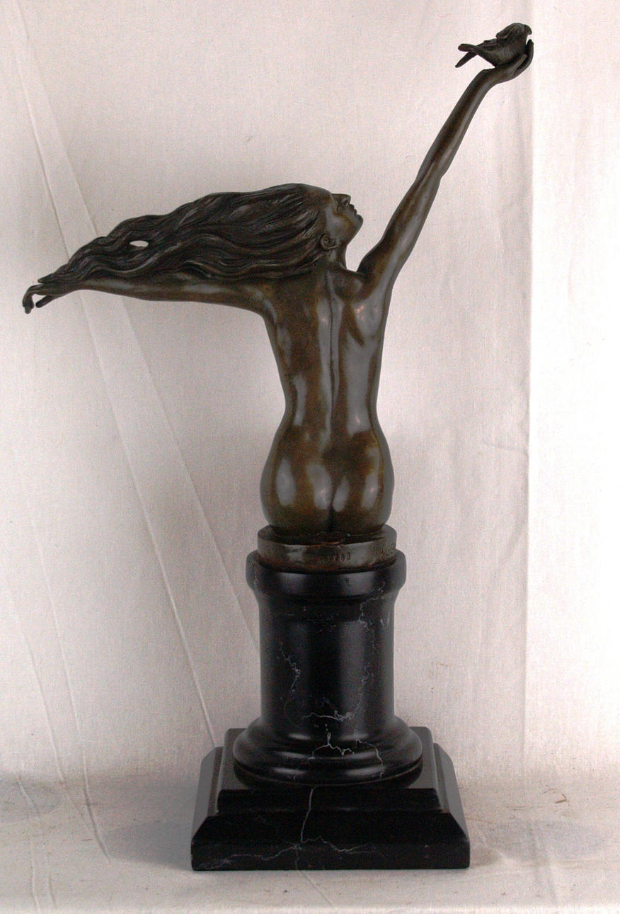 Gennarelli, Amedeo (1881-1943, ein Künstler und Bildhauer des Art-déco-Stils) - Bronzefigur "The Carrier Pigeon"/"Frau mit Vogel", junge Dame auf einem Marmorsockel sitzend, ein Arm mit Taube nach oben gehoben, anderer in die Richtung der auf dem Wind wehenden Haaren gestreckt, Art-Deco, 20.Jh., auf der Plinthe sign. "A.Gennarelli" und gestempelt "Bronze Garantie Paris J.B.Deposee", Marmorsockel H.ca.15cm, Ges.H.ca.41,5cm, B.ca.29,5cm.