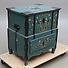 Verschleiß, Beschädigung, Wurmzunge. Renoviert, ergänzt, evtl. überarbeitet. Für die unterste Schublade gibt es einen Schlüssel. Spätere Malerei.