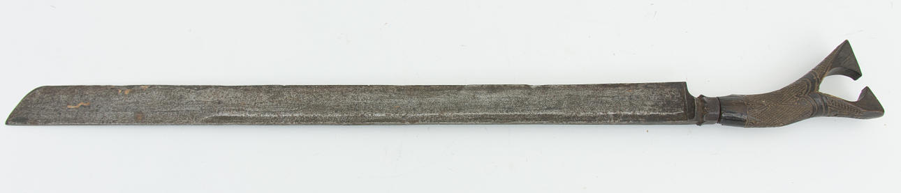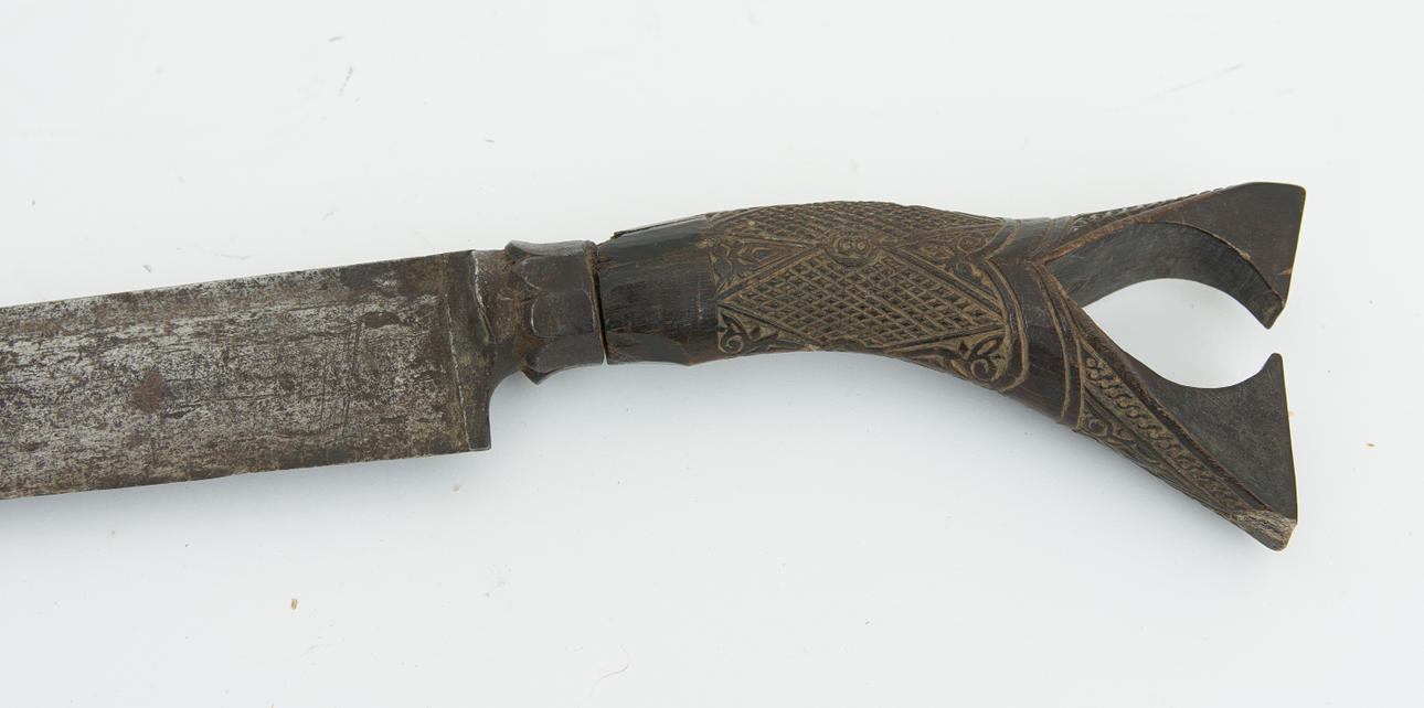 wohl Sumatra, Indonesien. Lange einschneidige gerade Klinge mit Hulu Peusangan Griff aus Holz, der fein beschnitzt ist mit abstrakten geometrischen Motiven, zwischen Heft und Klinge Reukueng Runglet Dekoration.