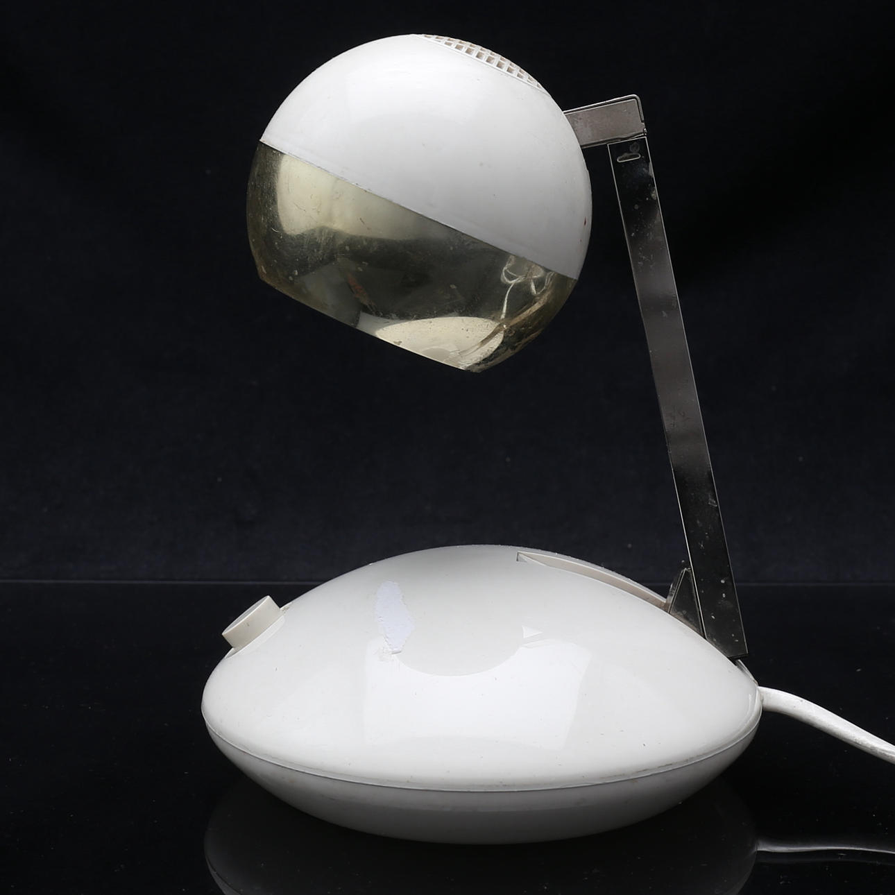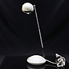 Tischlampe mit Teleskoparm, weißer Kunststoff und Chrom. Heben und senken Sie den leichten Arm. Maximale Höhe 45 cm.