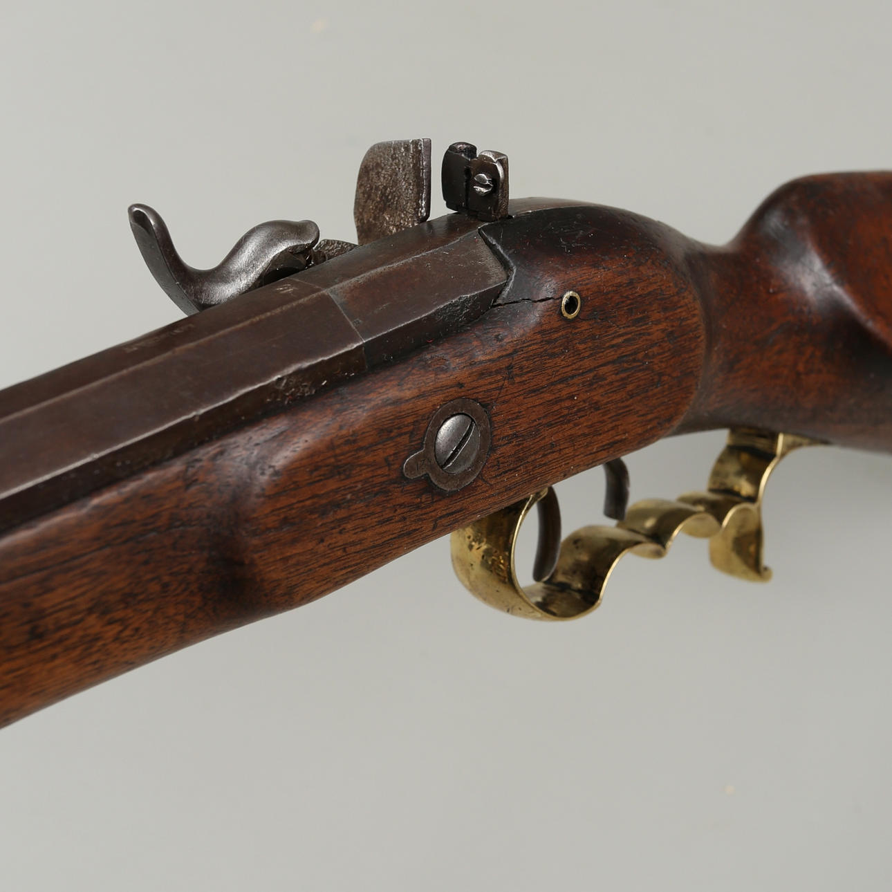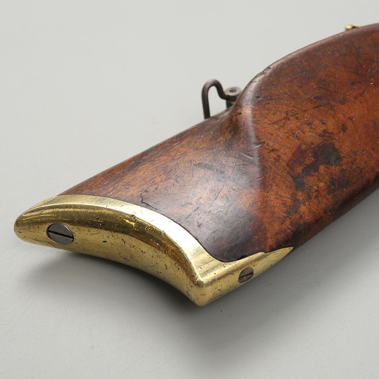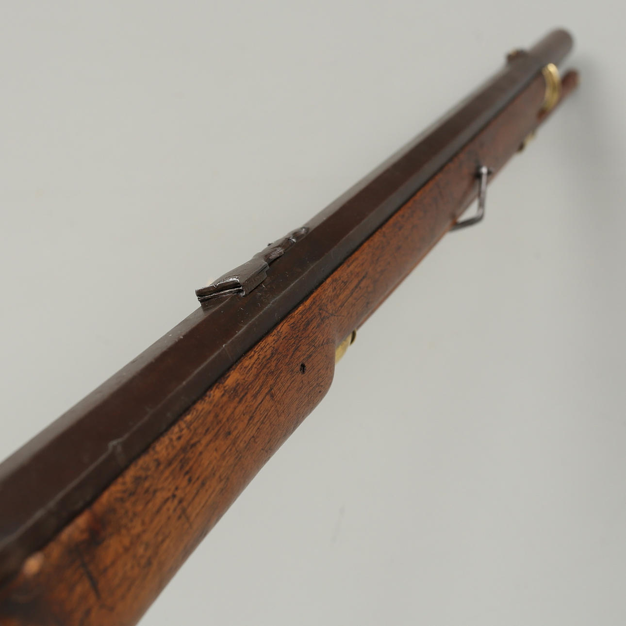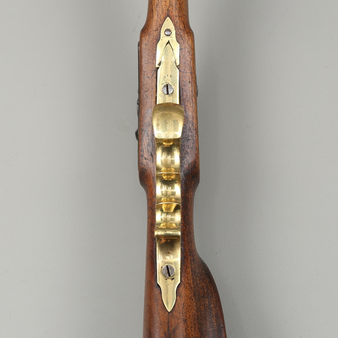 Türsteher mit kanneliertem Lauf, Reversed Buttlock, Feindruck, Vollschaft in Nussbaumholz, Messingbeschläge, Bajonettaufnahme für Säbel.