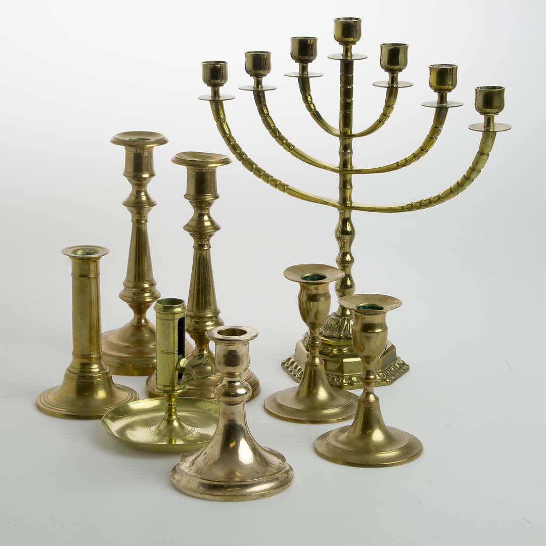 517765. KERZENLEUCHTER UND KERZEN, 8 Stück, Messing.