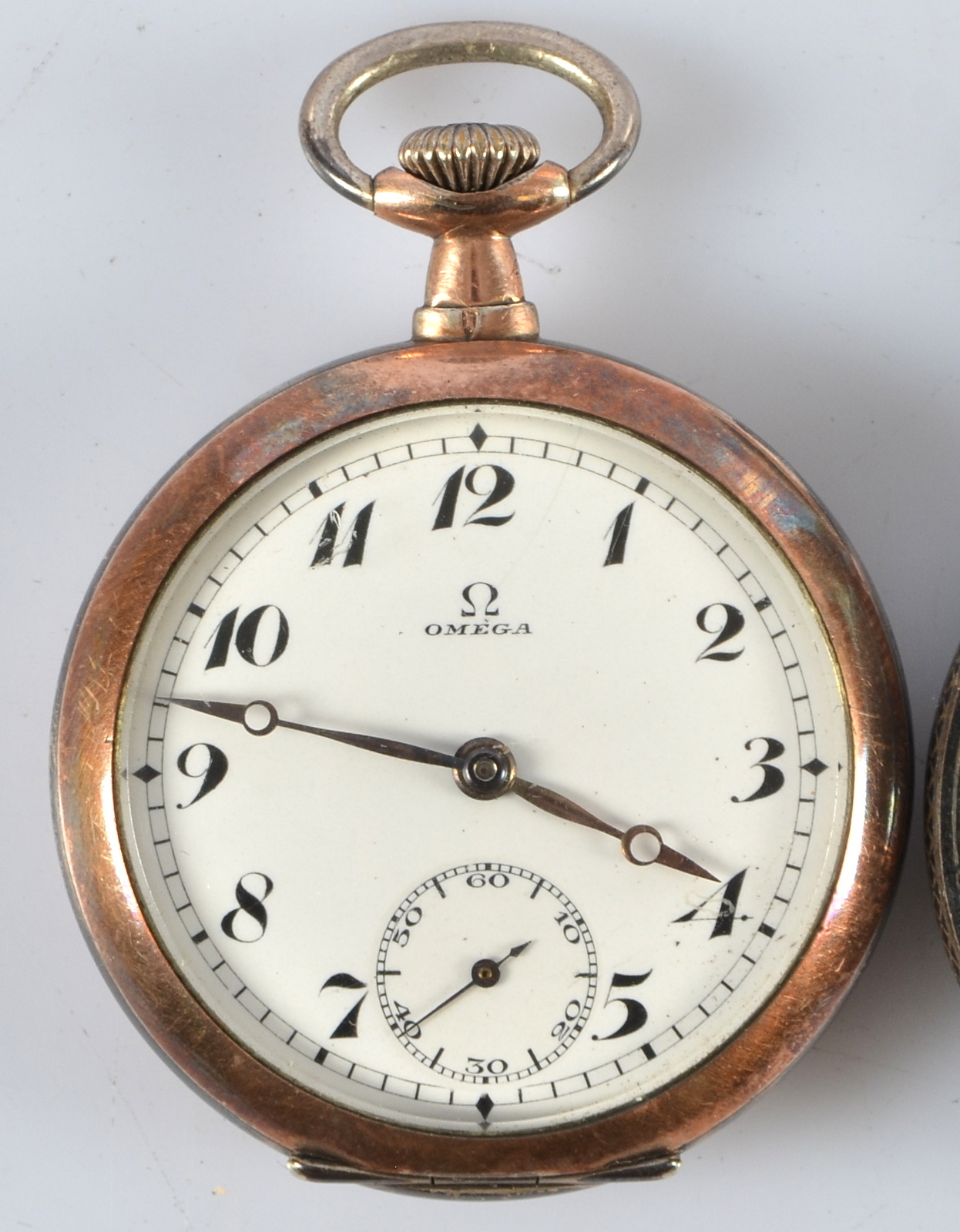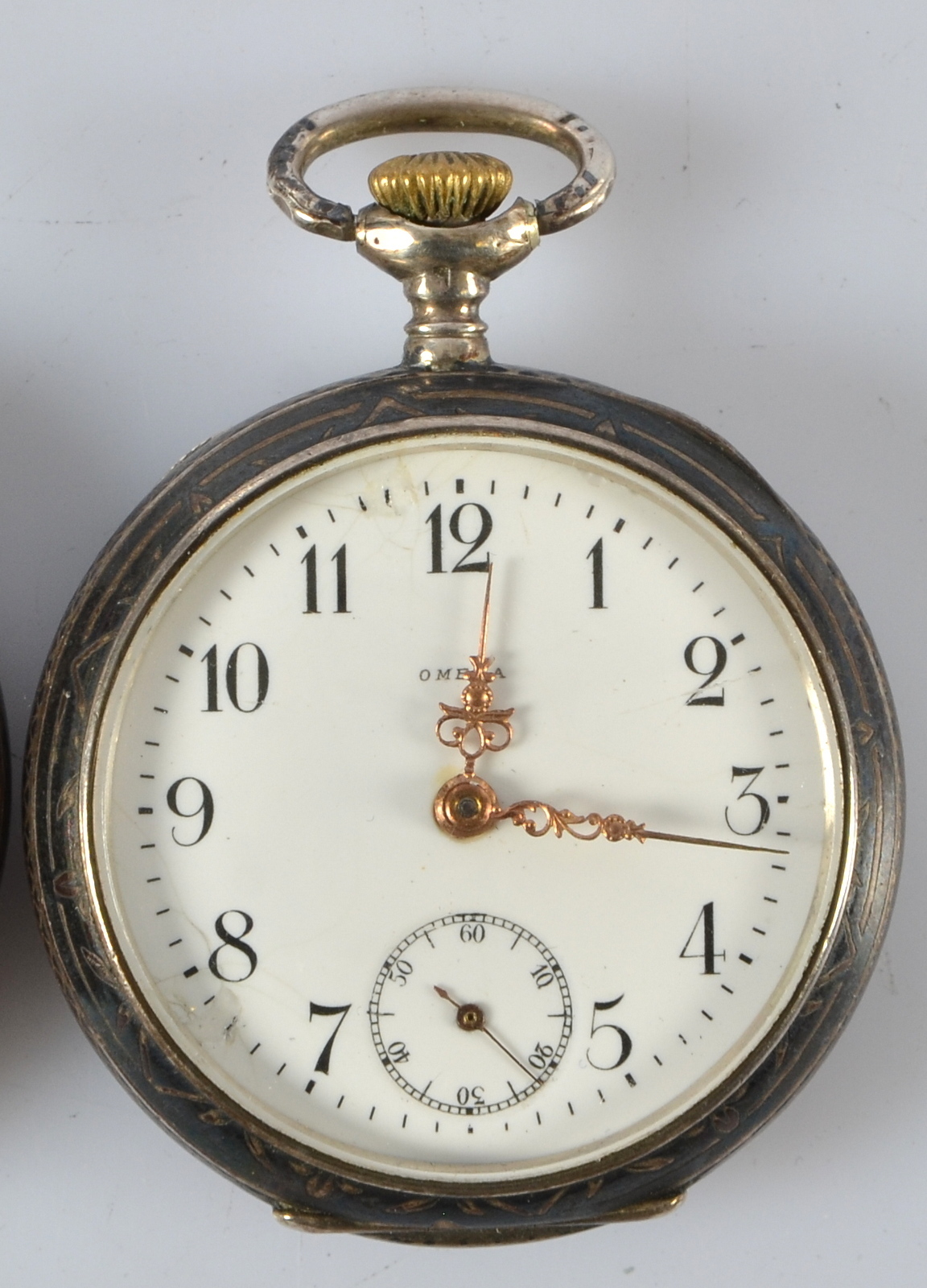 524339. GROßMUTTERUHR, 2 Stück, Omega, Silber, Niello-Dekor.