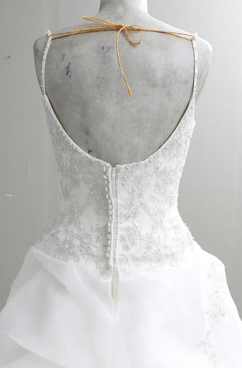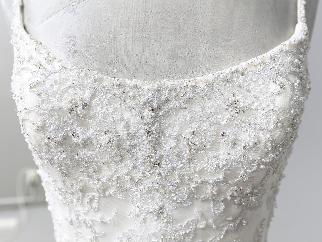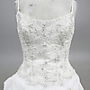 Modell mit üppiger Zierstickerei mit Perlen und Pailletten. Reißverschluss im Rücken mit verdeckten Zierknöpfen. Schmale Schultergurte.