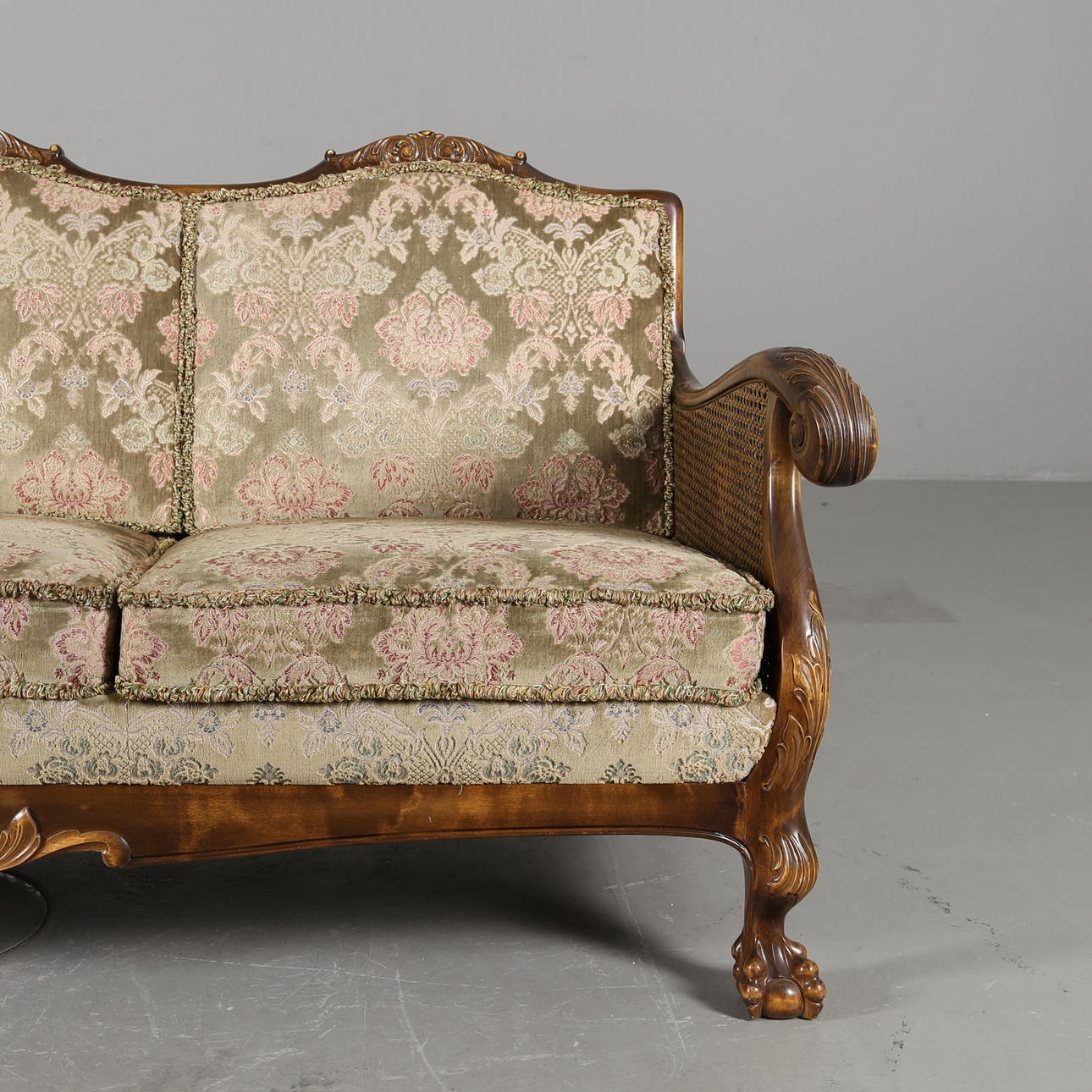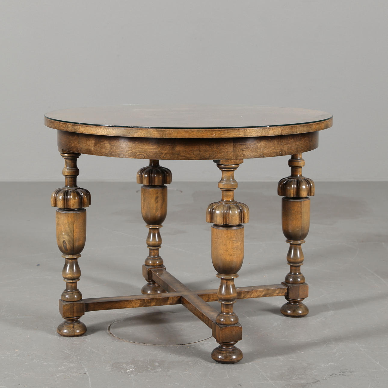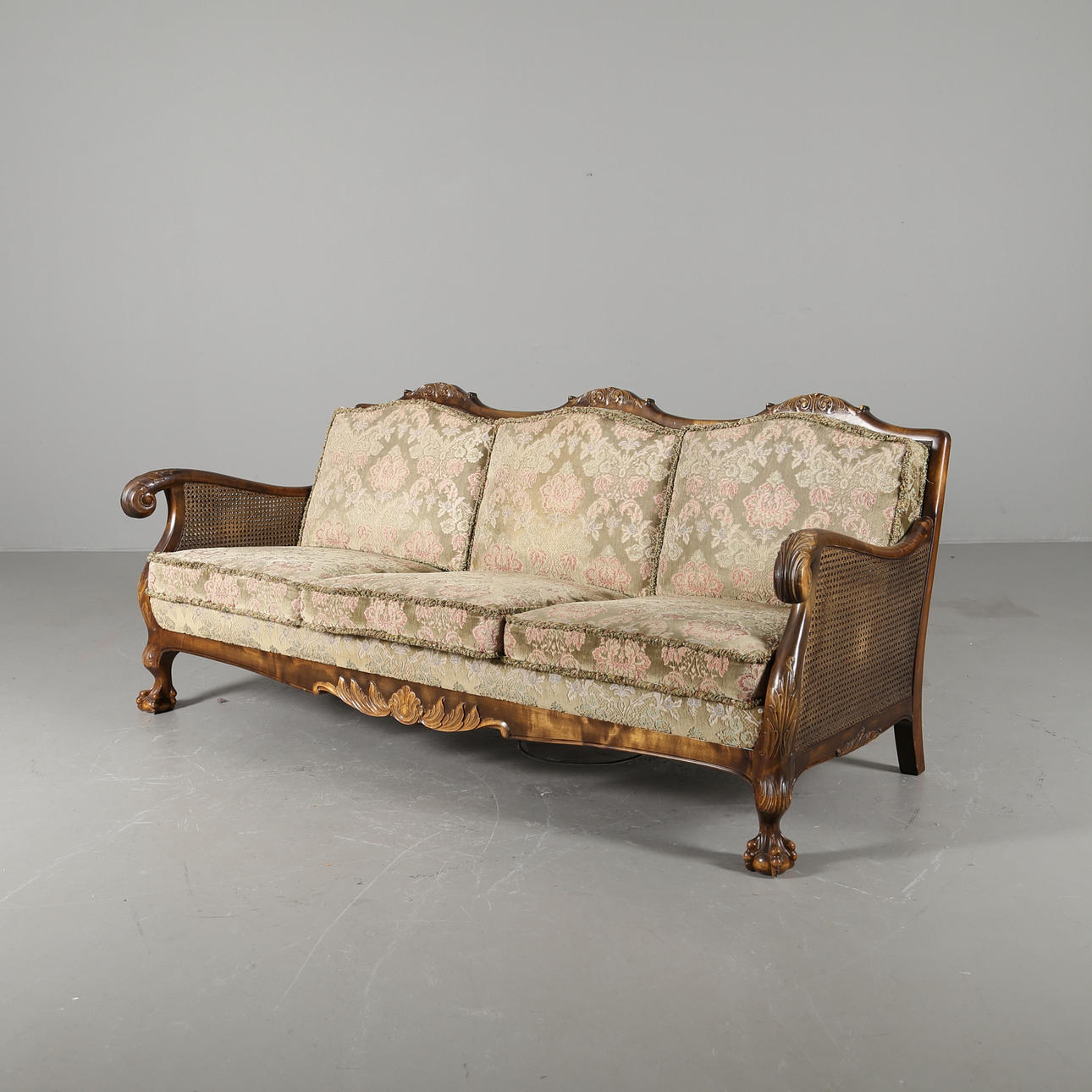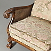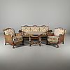 Sofa, Länge 190 cm, Höhe 82 cm, Sitzhöhe 41 cm Sessel, Höhe 82 cm, Sitzhöhe 41 cm Tisch mit Glasplatte, Durchmesser 80 cm, Höhe 61 cm.