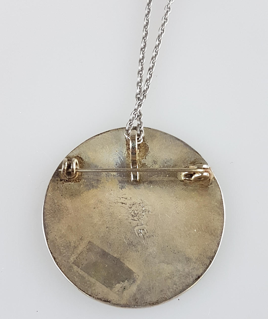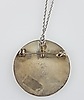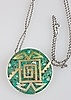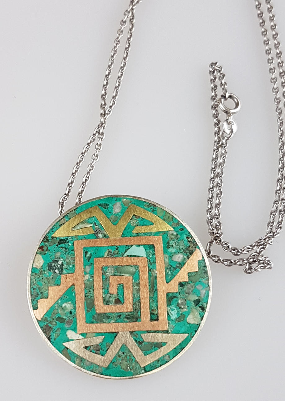 Konvolut Silberschmuck Mexiko - 2-tlg:Silber mit Türkiseinlagen,Anhänger/Brosche,verso unleserliche Punzen,Dm.ca.4cm,Kette gestempelt 925, L.ca.32cm,Ring:Ringkopf-Dm.ca.15mm,geste mpelt ''Mexico 925'',Dm.ca.18mm,Gew.zusammen ca.30g.