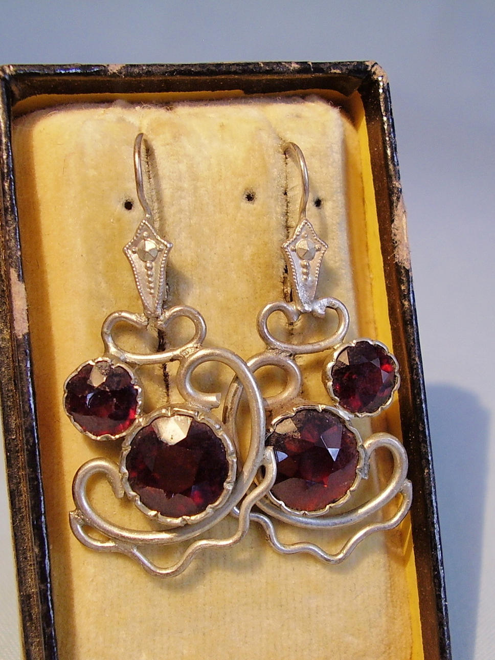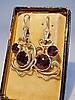 Sie sind als Ohrhänger mit Klapp-Ohrbügeln gefertigt und tragen eine große Abhängung, die mit jeweils zwei großen rund facettierten Granaten in antiker Rosenform geschliffen sind.