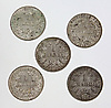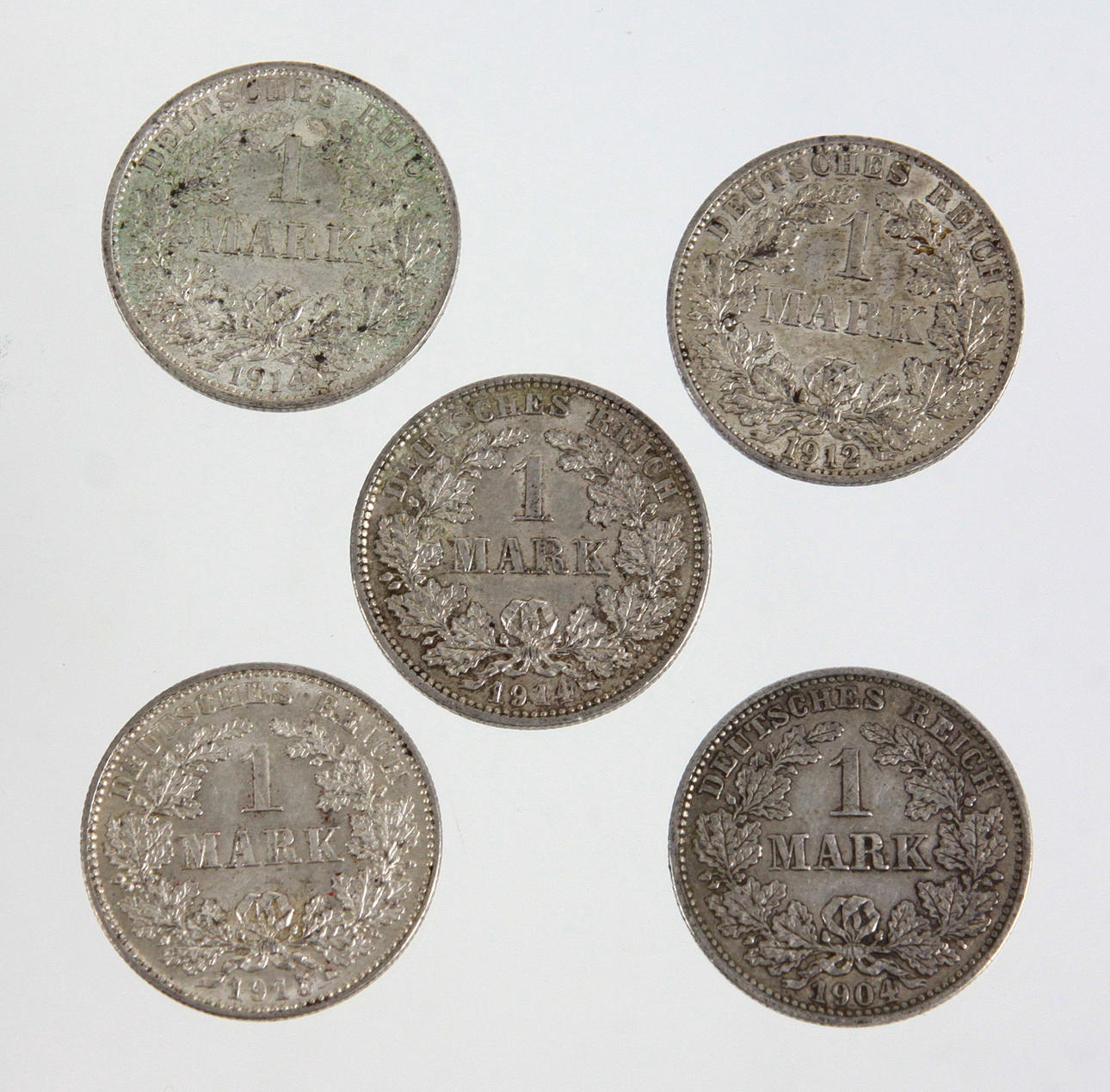 5x 1 Mark Deutsches Kaiserreich, verschiedene Jahrgänge 1904 E, 1912 A, 1914 A, 1914 E, 1915 E, Erhaltung SS-VZ.
