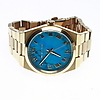 Der Durchmesser der Uhr beträgt ca. 38 mm. Blaues Zifferblatt. Römische Zahlen. Quarz. Armband und Gehäuse in Gold. Zusätzlicher Link. FALL.