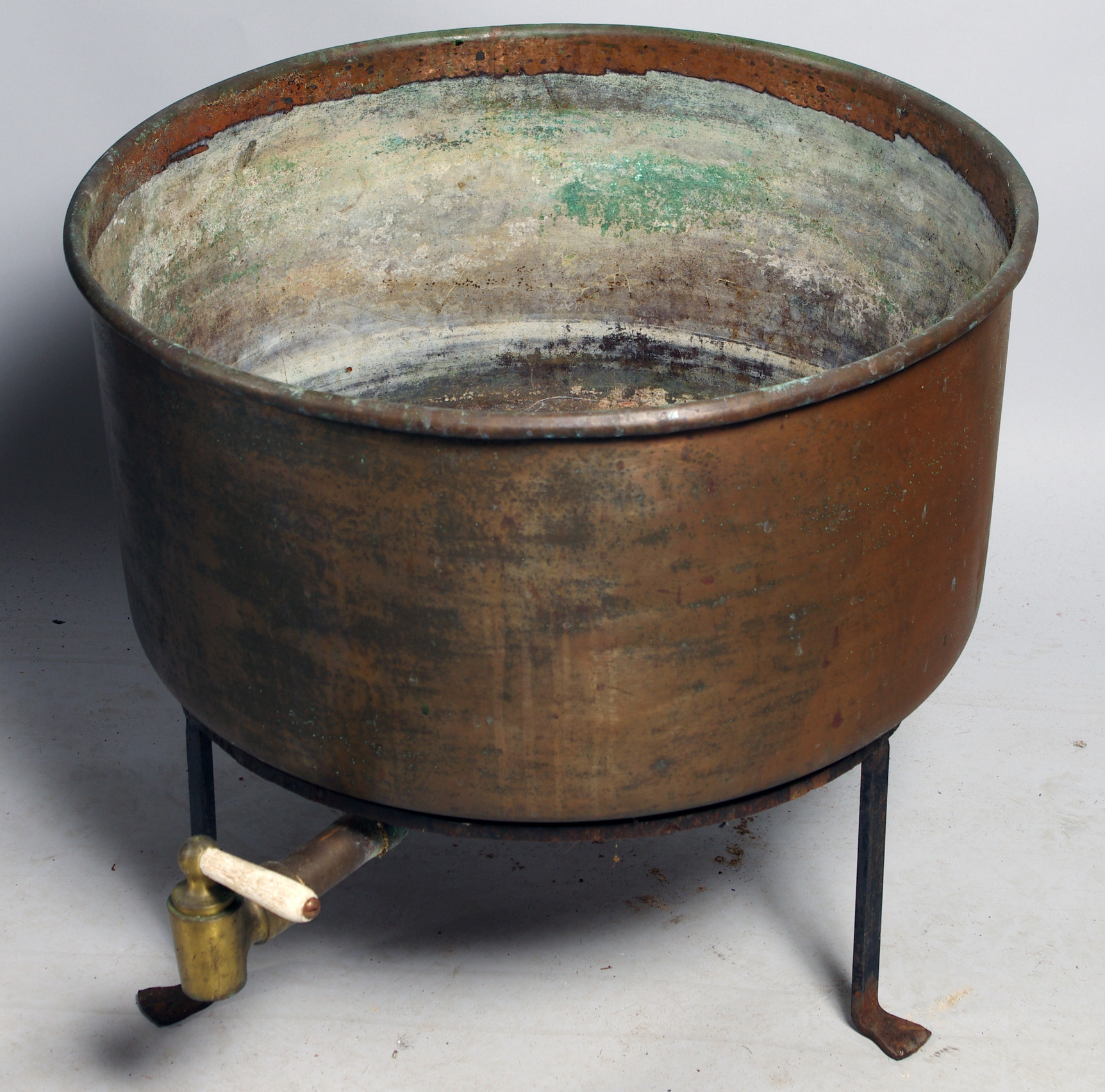 55689. KUPFERTOPF mit Zapfhahn und Schmiedeständer.