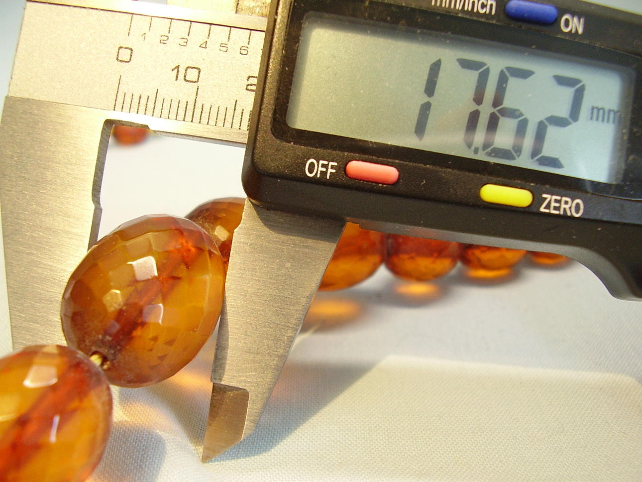 Kettenlänge 63 cm, Durchmesser der Bernstein-Oliven von 7,2 mm bis 17,7 mm, Länge der größen Bernstein-Olive 23,8 mm, Gewicht 38 Gramm.