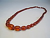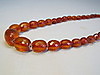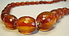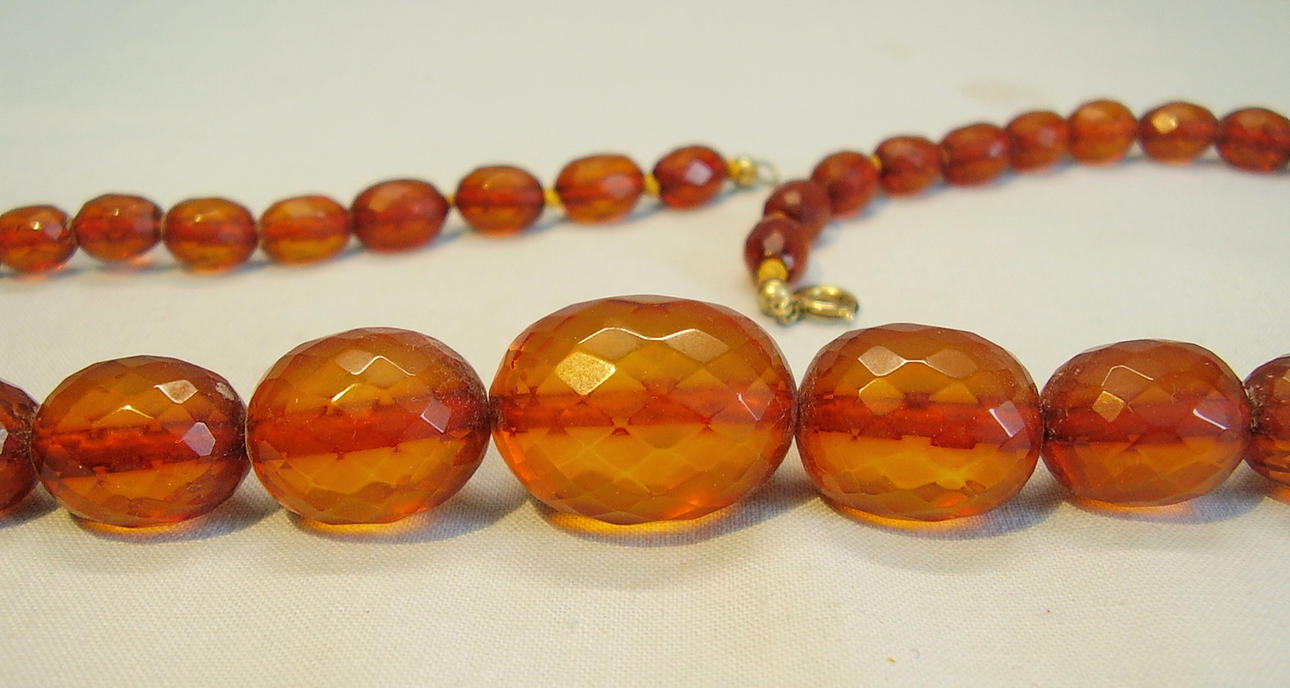 Die Kette ist aus allseitig facettierten Bernstein-Oliven im Königsberger Schliff gearbeitet und mit Sicherheitsknotung aufgezogen. Die herrlich glänzenden Bernstein-Oliven sind von schöner honigbrauner bis rötlicher Farbe, sie sind im Größen-Verlauf angeordnet. Geschlossen und geöffnet wird die Kette durch einen Federring-Verschluss in Golddoublé.