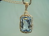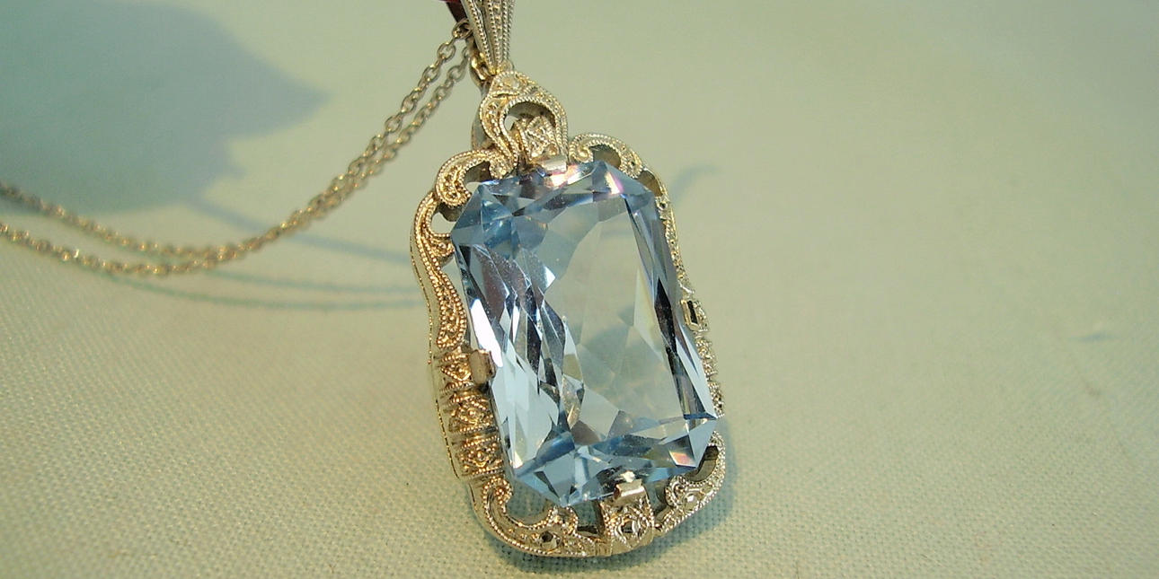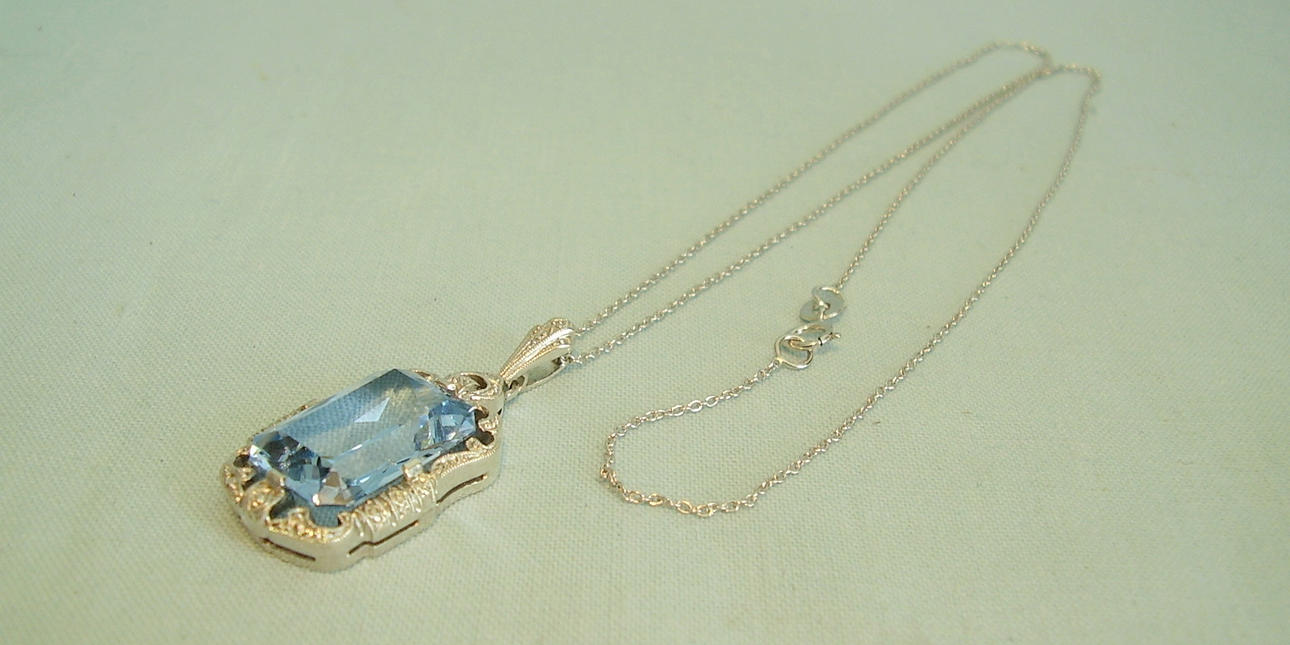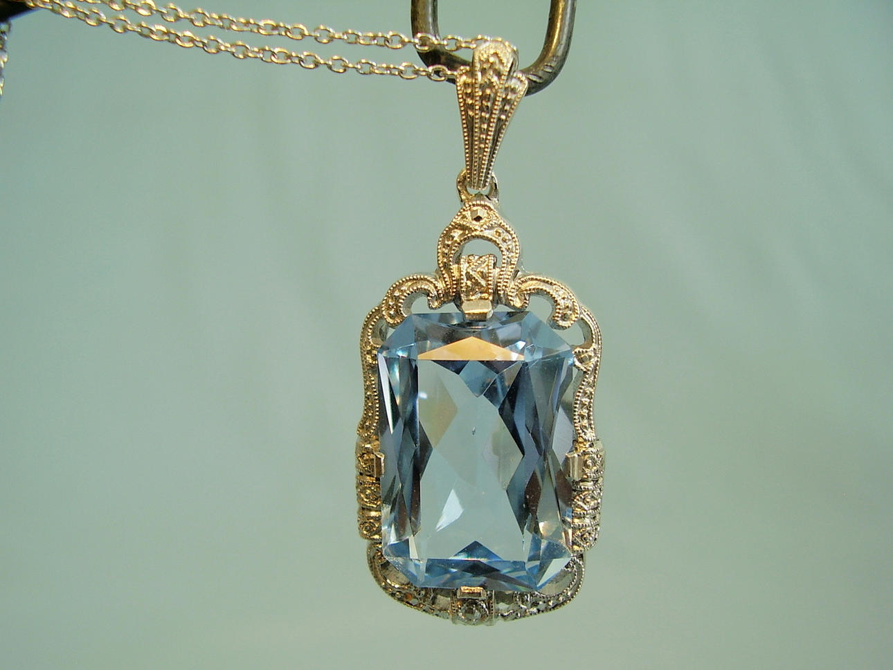 Der Anhänger ist in langrechteckiger Form gearbeitet und mit einem Aquamarin-Spinell besetzt im antiken Scherenschliff von feinster Millegriffes-Oberfläche umgeben.