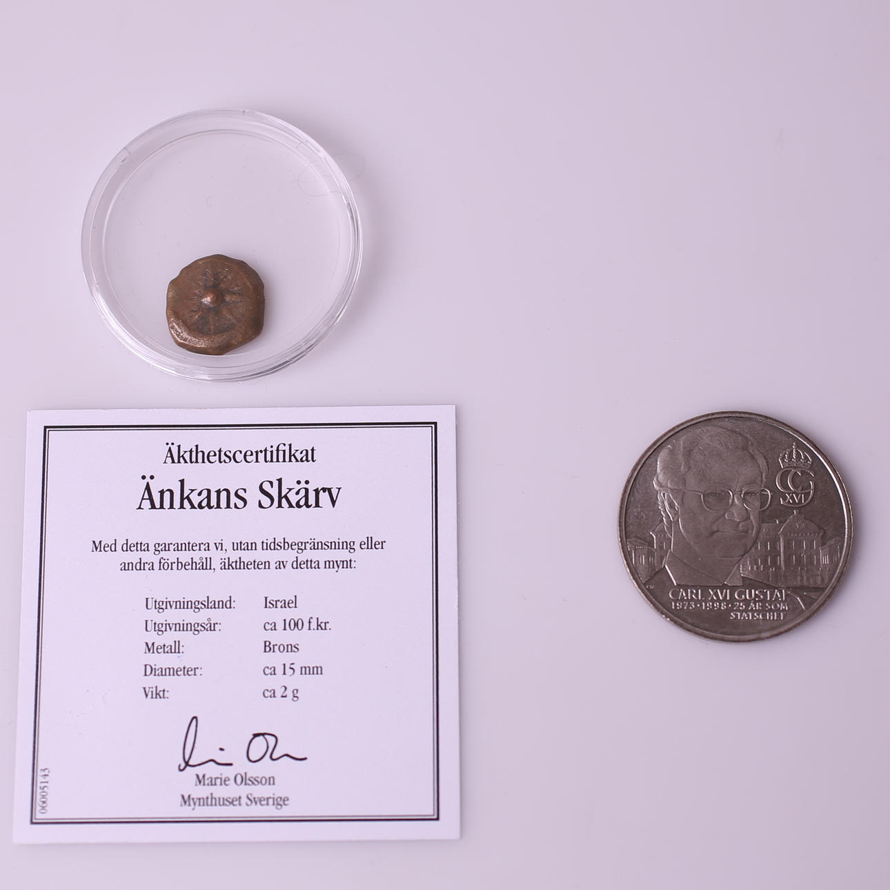 Bronzemünze, ca. 100 Jahre v. Chr., „Witwenscherbe“, Prägeland Israel, Durchmesser ca. 15 mm, Gewicht ca. 2 Gramm.