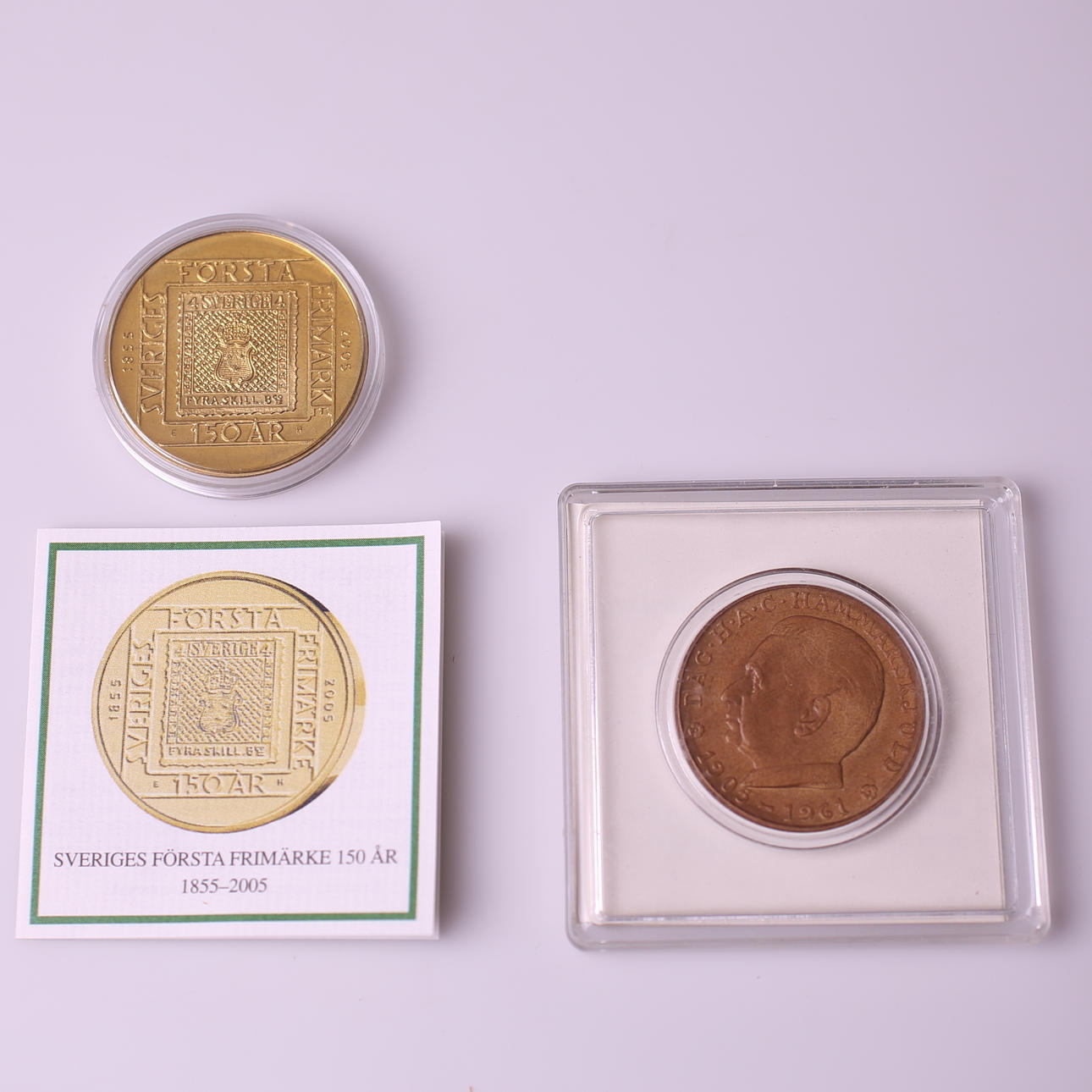Gedenkmünze SEK 50, Jahr 2005, vergoldet, Schwedens erste Briefmarke 150 Jahre 1855-2005 "Four Shillings Banco", Durchmesser 36 mm, Gewicht 22 Gramm.
