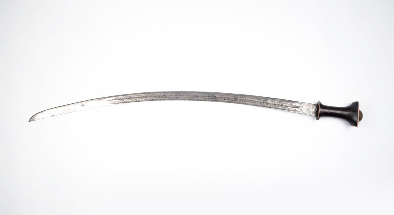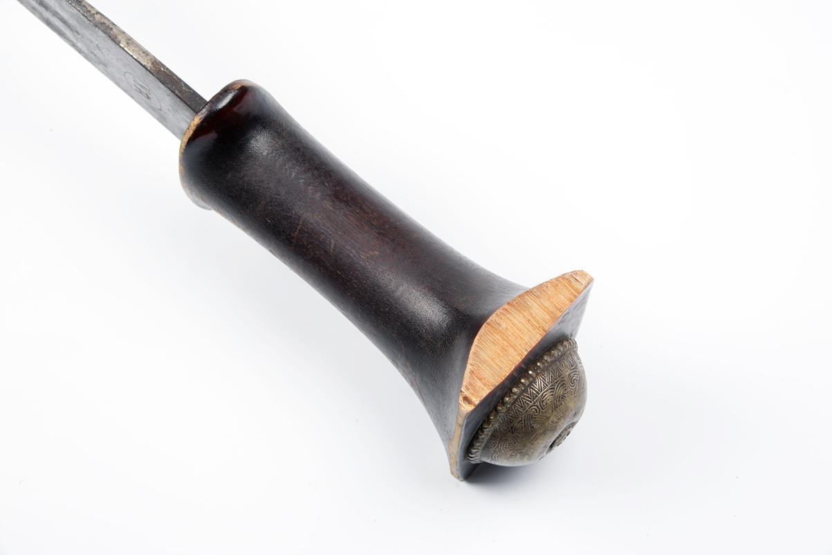 Semitantiker Langsäbel, wohl nicht kampferprobt, mit doppelt gekehlter Klinge sowie Monogramm MK nahe des hölzernen Griffstücks. Länge ca. 105 cm.
