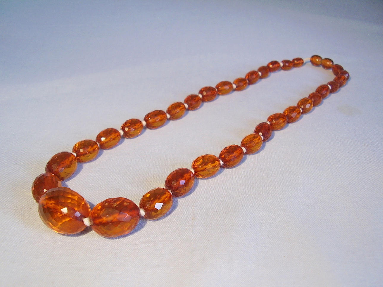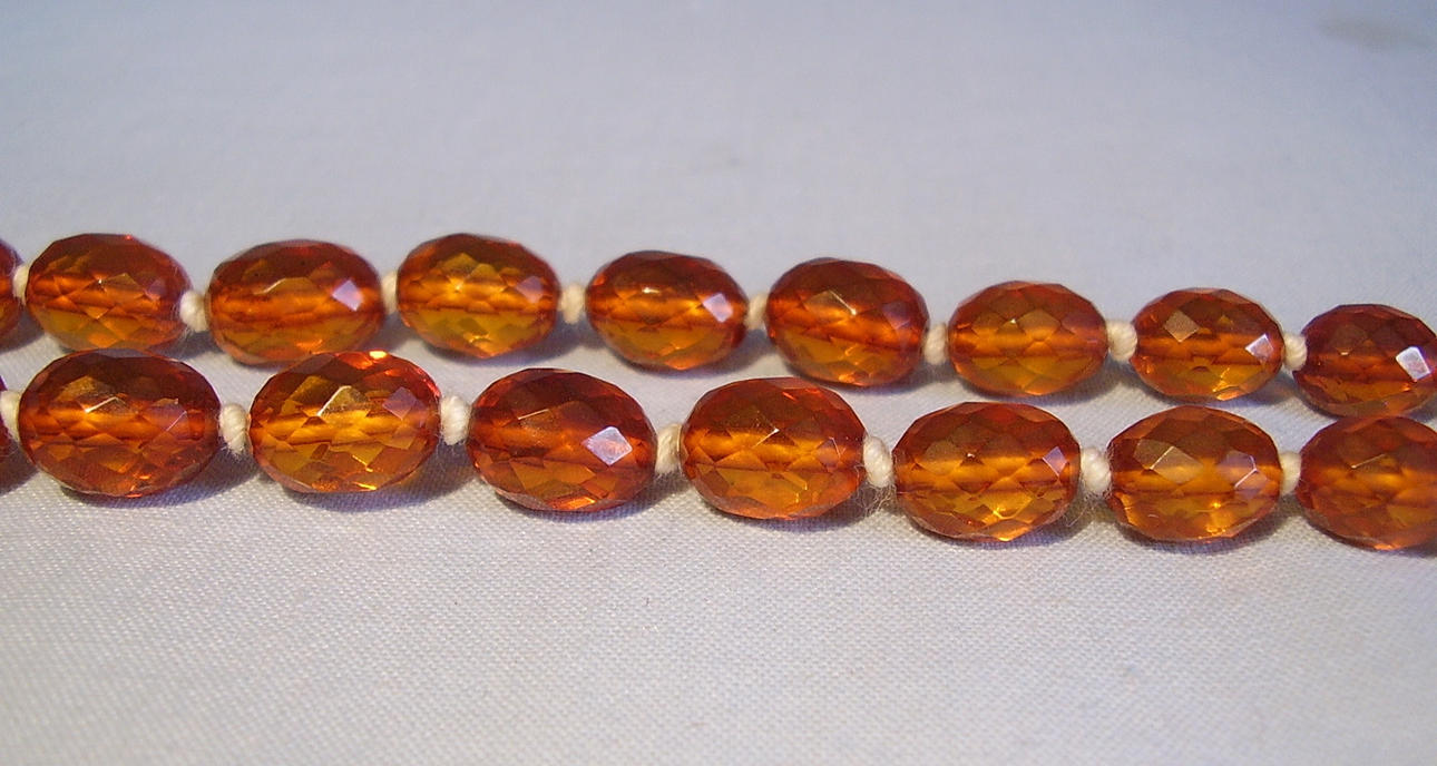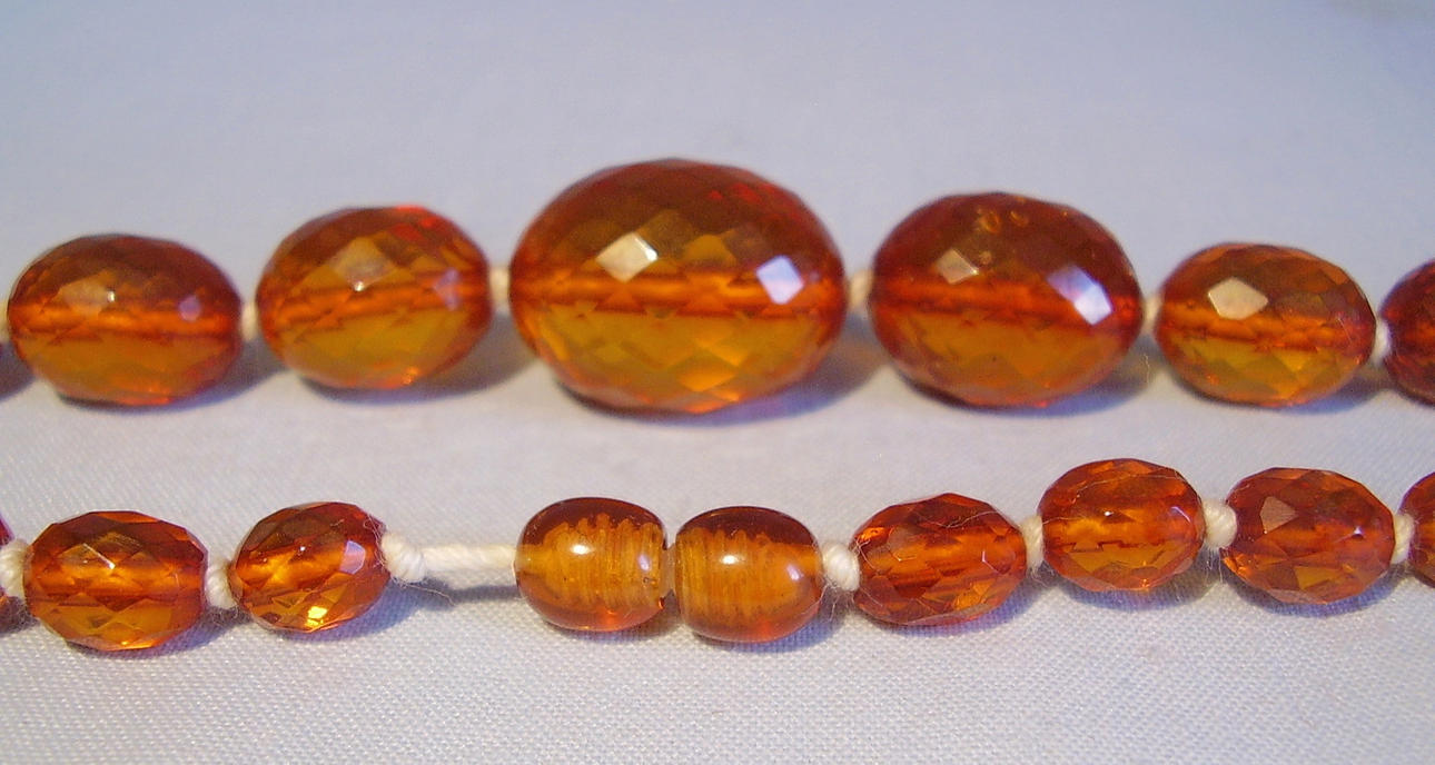 Die Kette ist aus allseitig facettierten Bernstein-Oliven im Königsberger Schliff gearbeitet und mit Sicherheitsknotung aufgezogen. Die herrlich glänzenden Bernstein-Oliven sind von schöner honigbrauner Farbe, sie sind im Größen-Verlauf angeordnet.