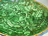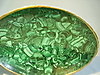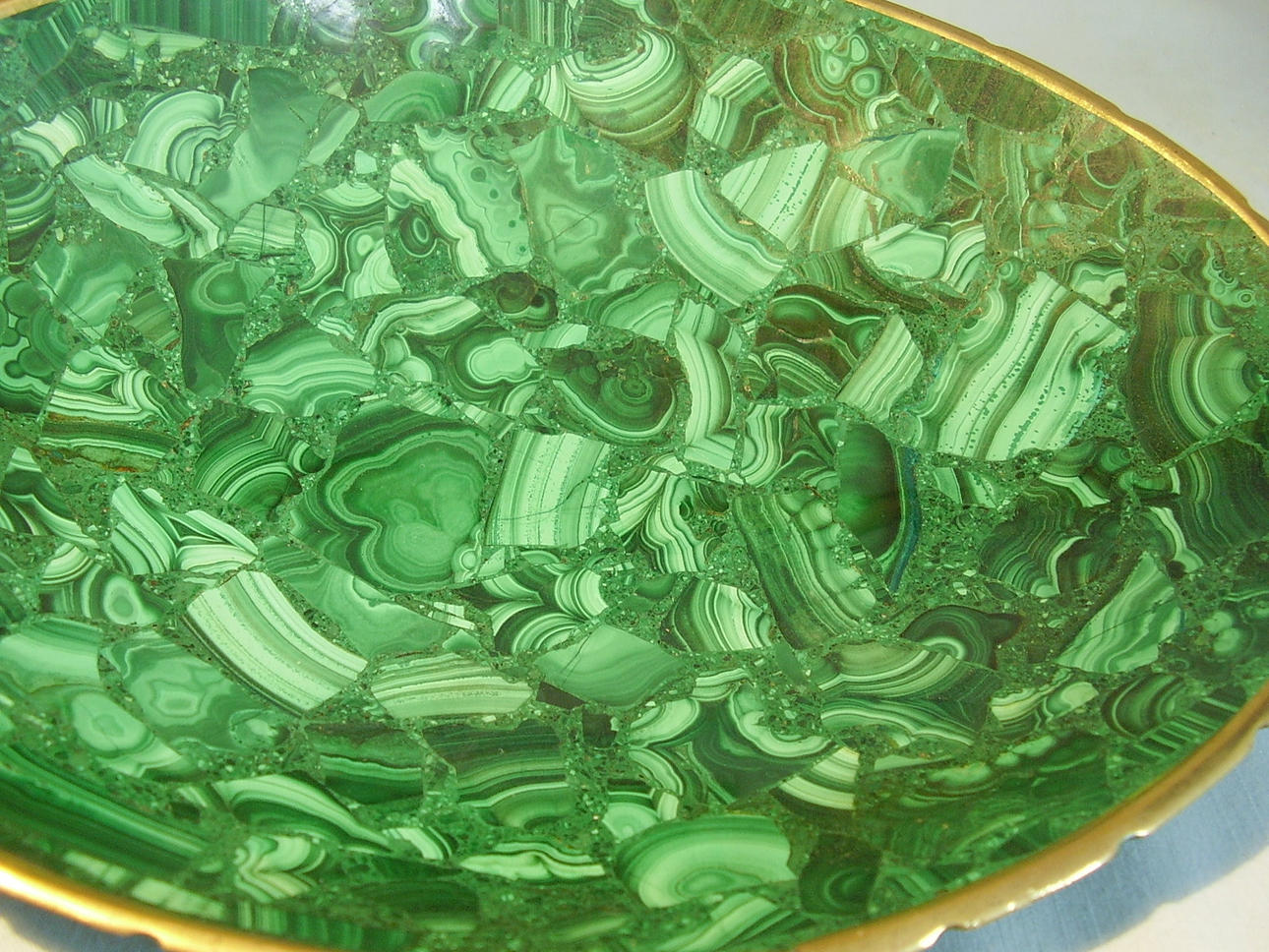 Die ovale Schale ist aus massivem Malachit zusammengesetzt und als gemuldete Schale gearbeitet in fein polierter Oberfläche umgeben von poliertem Bronzerand.