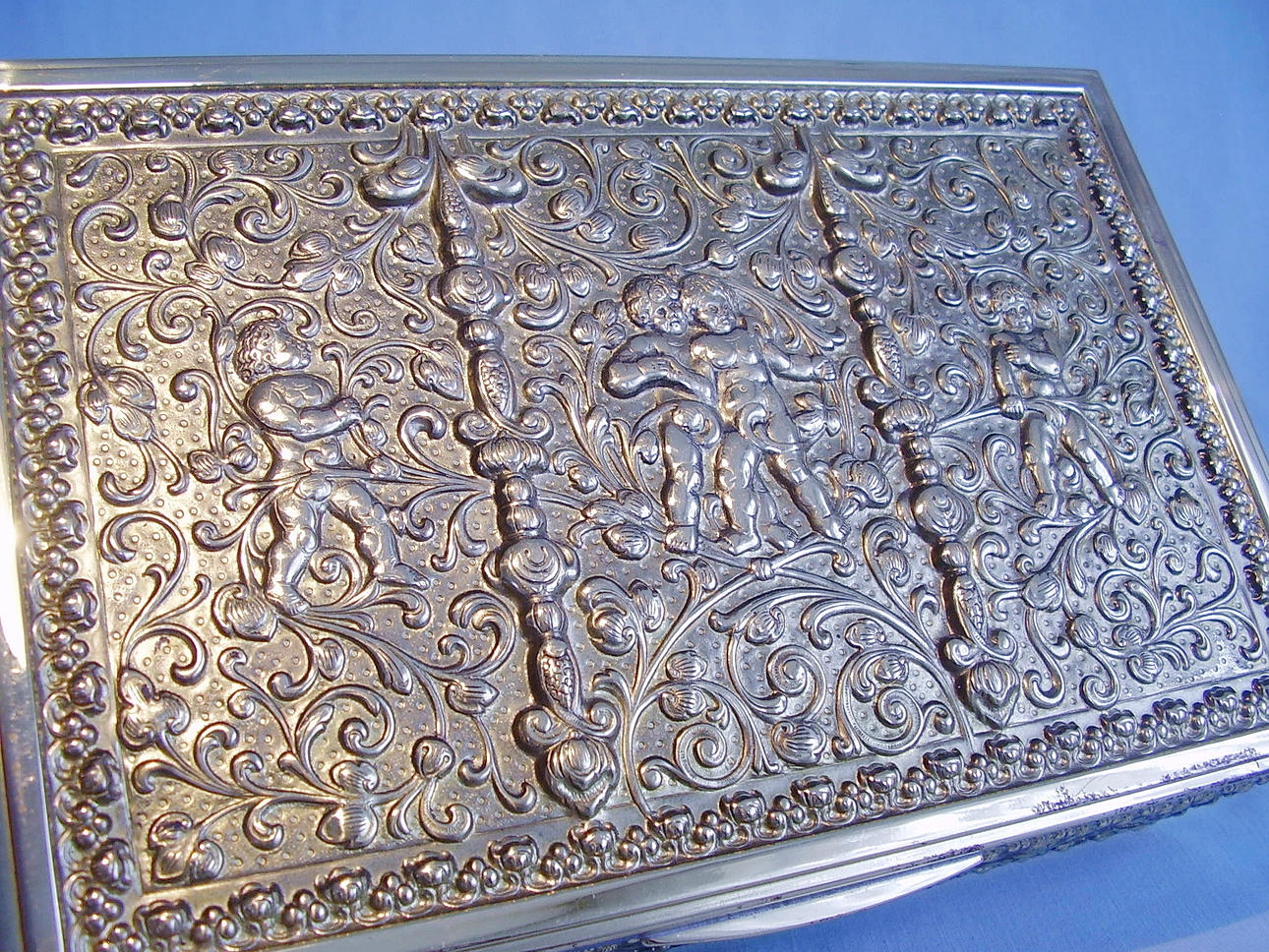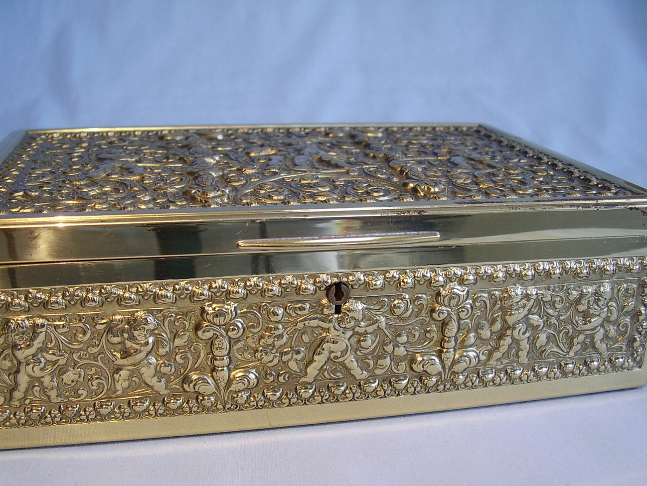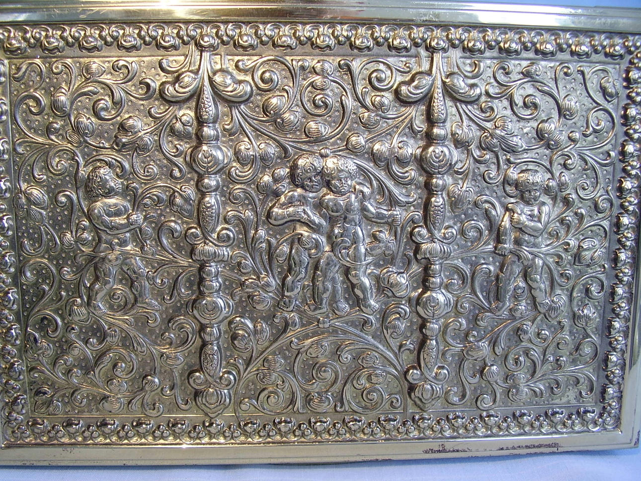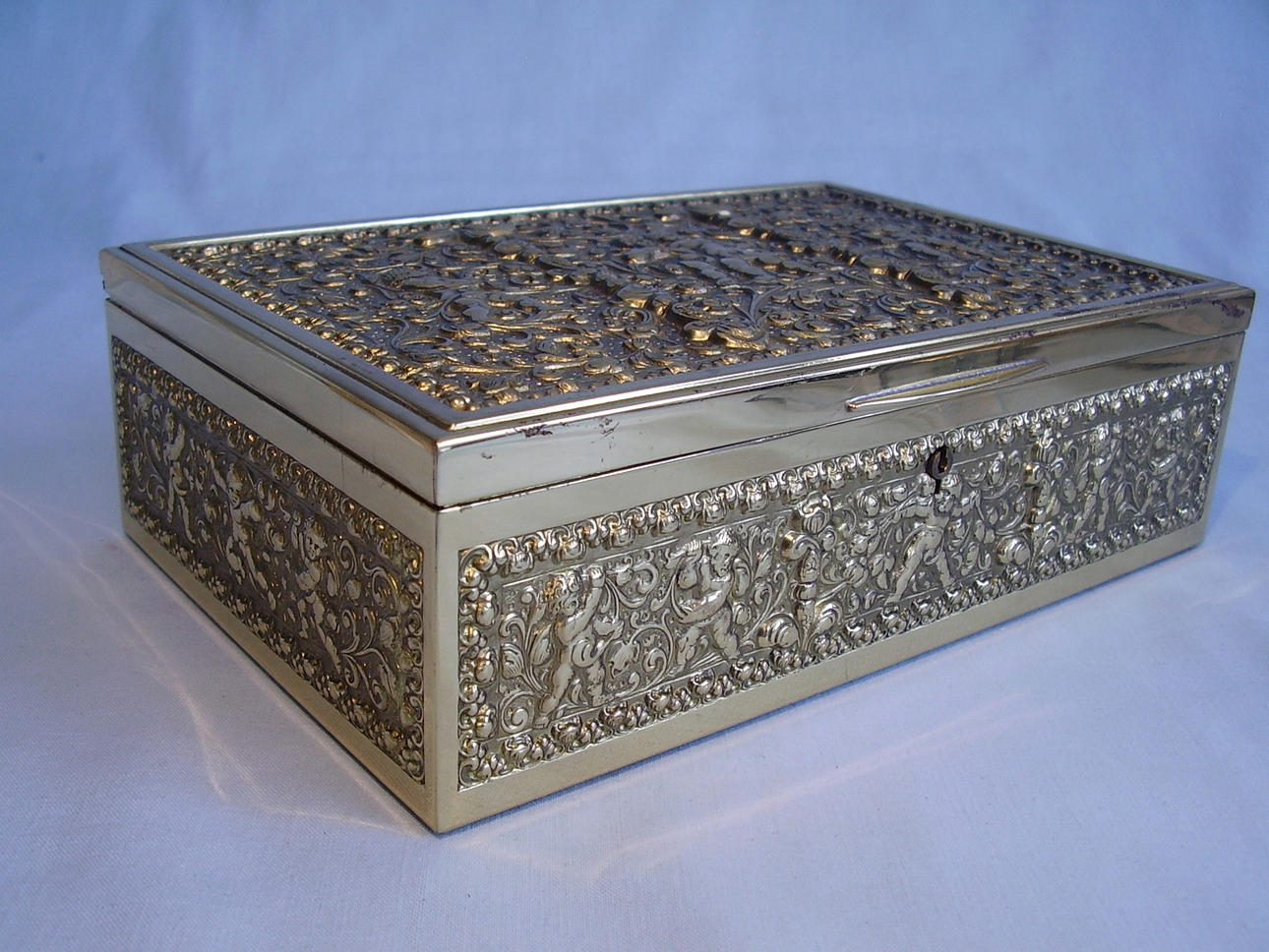 Deckel und Wandung mit reliefierten Puttendarstellungen sowie Jugendstil-Ornamentik. Starke Reliefierung mit kompletter Vergoldung.
