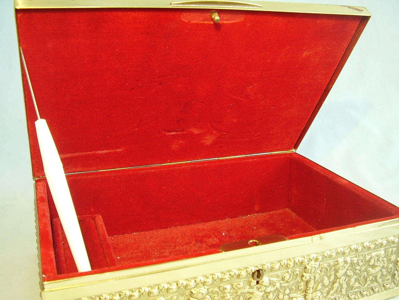 Innen ist die Schatulle mit dunkelrotem Samt ausgekleidet und hat eine Aufnahme für Ringe sowie Platz für weitere Schmuckteile, unterseits ist sie mit dunkelblauem Filz bezogen.