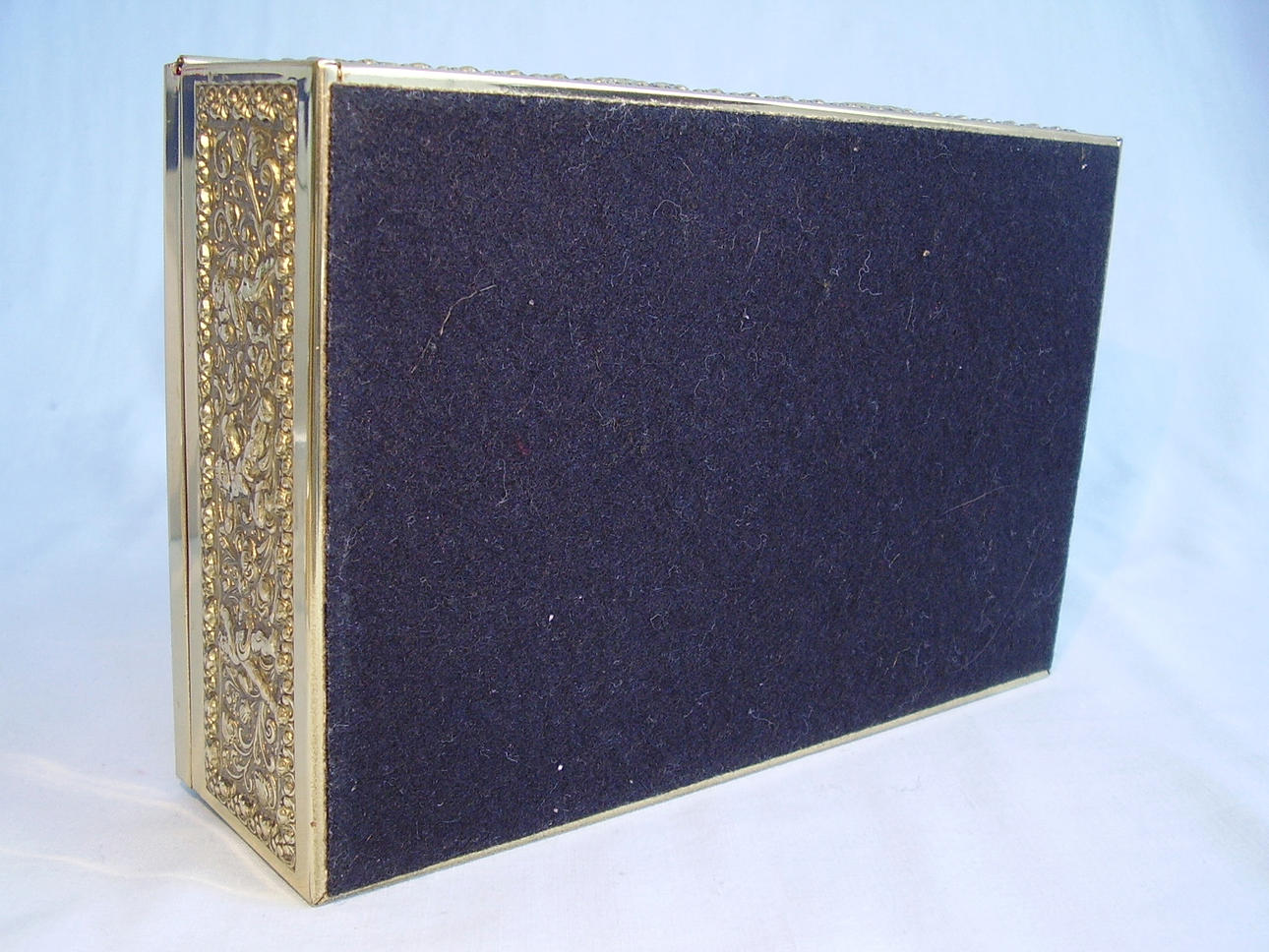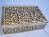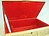 Rechteckige Form mit scharniertem Deckel sowie frontseitigem Schloß ohne Schlüssel.