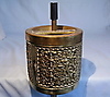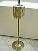 Jugendstil Stand-Aschenbecher, als Schleuderascher gearbeitet. Und mit umlaufendem reliefierten Puttendekor ausgeführt. Wenn man den Bakelitgriff nach unten drückt, wird die Asche durch Drehbewegungen der Metallscheibe ins Innere befördert. Der Ascher ist auf einem gerilltem Stiel befestigt, der unten in eine große leicht gewölbte runde Standscheibe mit Beschwerung übergeht, die am Rand die gleichen Putten-Reliefs wie oben aufweist.