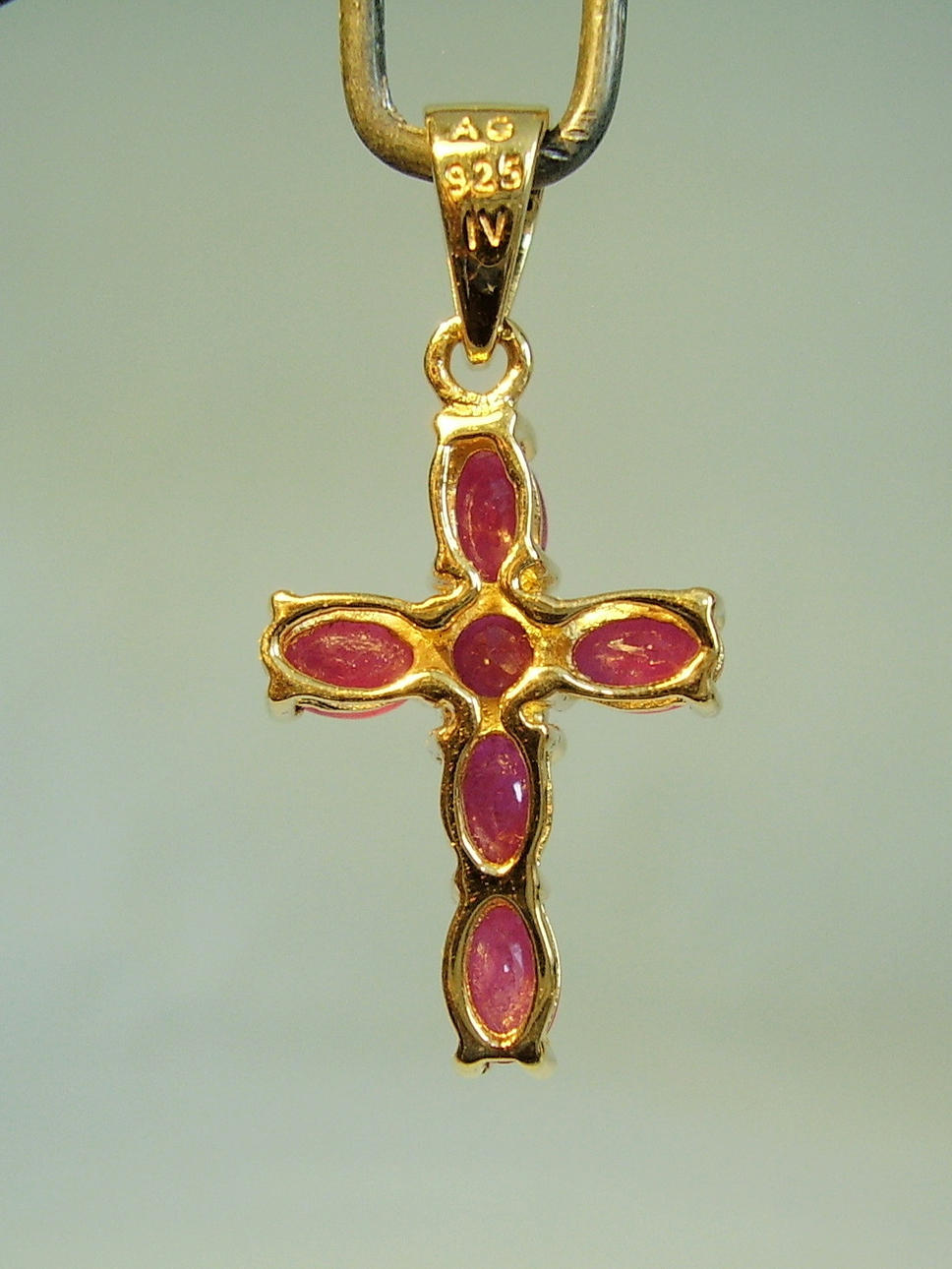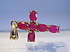 Er ist in Kreuz-Form gefertigt und mit 5 oval facettierten sowie 1 rund facettiertem Rubin besetzt, die durch Krappen-Fassungen gehalten werden.