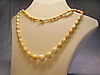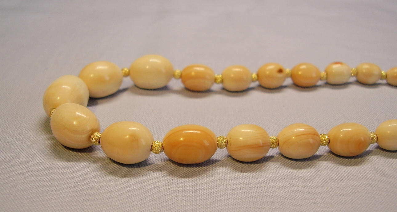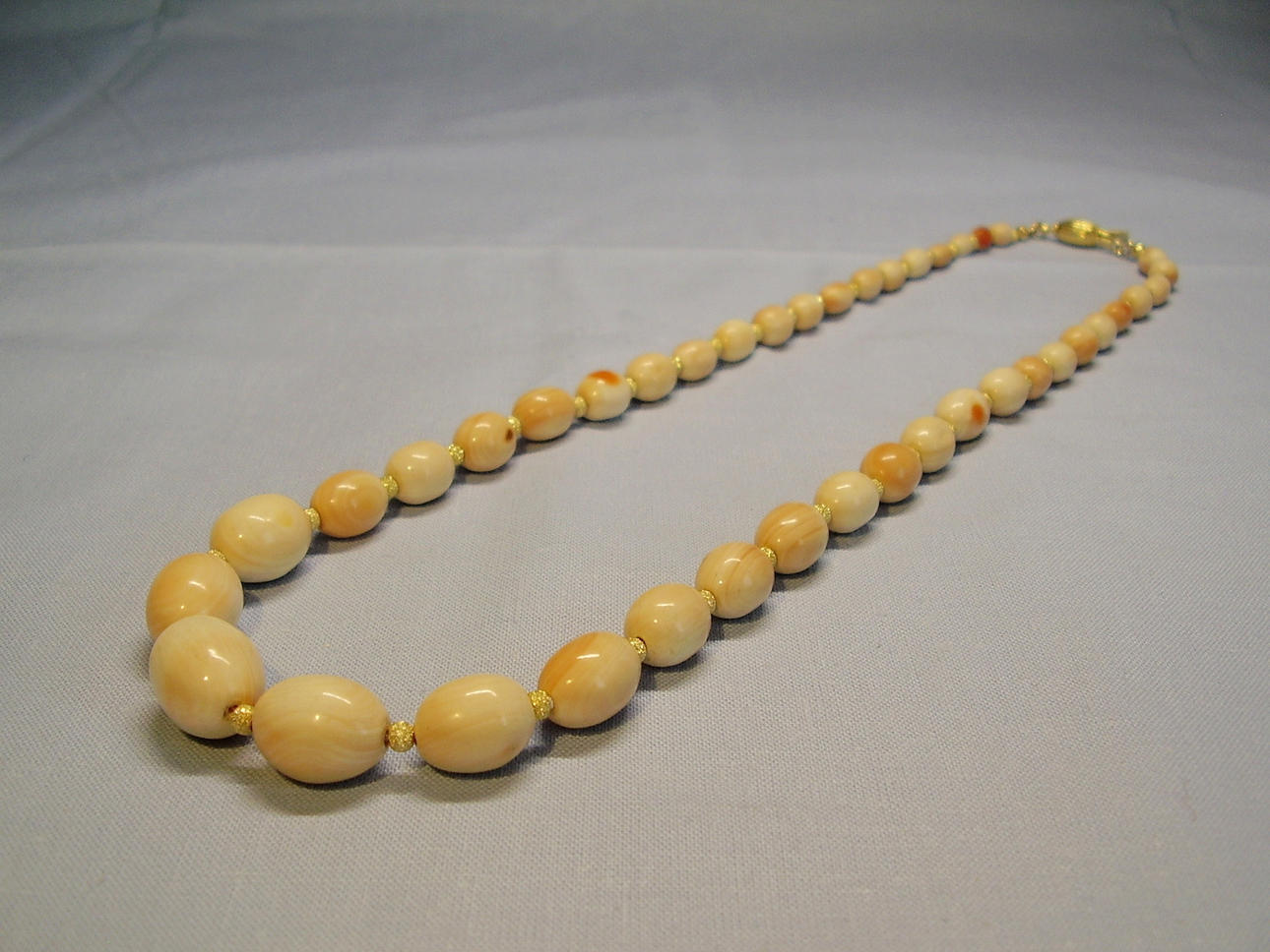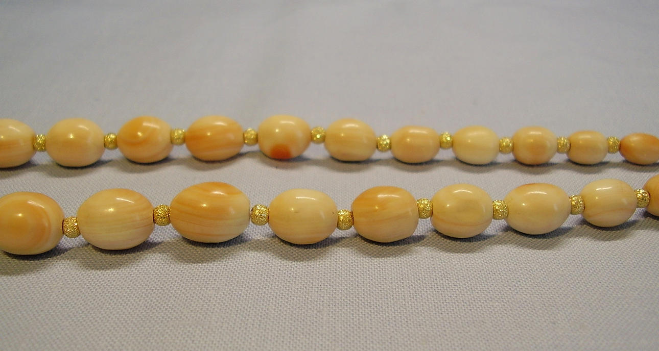 Die Kette ist aus fein polierten, hellen Korallen in schöner Maserung im Verlauf gearbeitet. Die Korallen-Glieder sind in Oliven-Form handgeschnitten und handpoliert. Zwischen den Koralle-Oliven sind vergoldete Silberkugeln in satinierter Oberfläche angebracht, die die einzelnen Knoten verdecken.