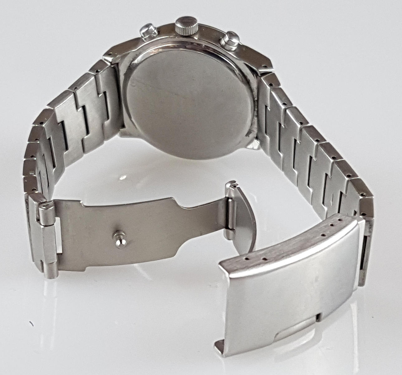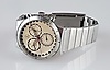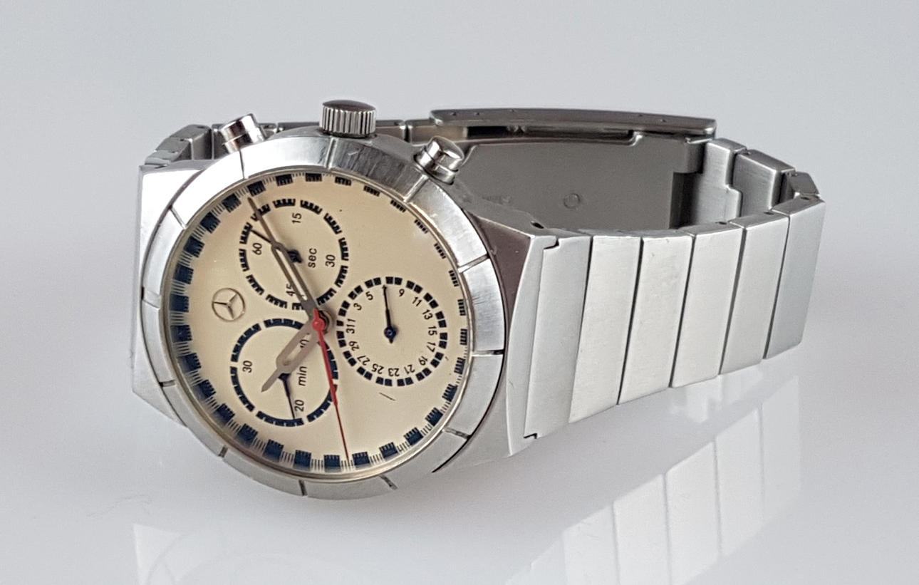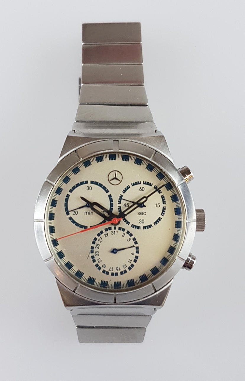 Herrenarmbanduhr - Mercedes Benz Collection, Chronograph, Zifferblat in Gold Metallic, Strichindizes, Anzeigen für Minute, kleine Sekunde, Stoppuhr-Funktion eingeschränkt, Edelstahlgehäuse und -Band, Dm. ca. 35mm, Bandbreite: 16 mm, Gewicht: 100 g, funktionsfähig.