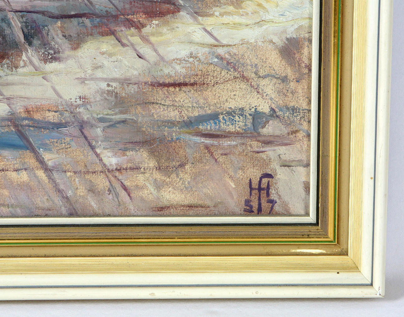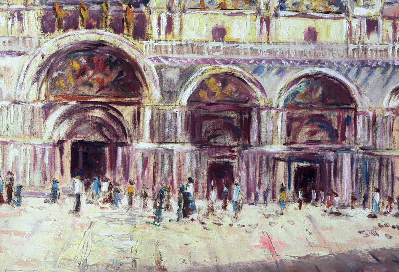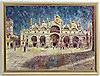 Öl/Lwd. rechts unten monogrammiert HF sowie datiert (19)57, Helmut Fiedler*1916, †2015, querformatige lebhafte Partie mit Blick auf Markusplatz u. die Markuskirche in Venedig, kontrastreiche Farbpalette, pastoser Duktus, expressive Malweise, ca. 80 x 60 cm, im Profilrahmen, ca. 86,5 x 66,5 cm.