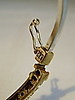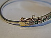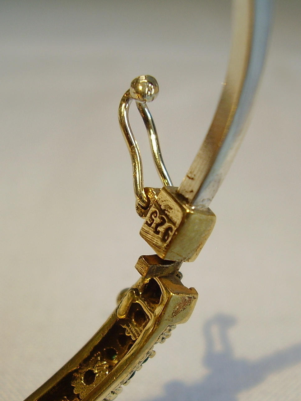Die Armspange ist in Silber 925 gearbeitet und auch so am Verschluss punziert. Der Armreif mit dem ovalen Querschnitt ist mit Scharnier und Einhak-Verschluss + Sicherheitsacht ausgestattet und kann deshalb geöffnet und leicht angelegt werden. Das Oberteil des Armreifes ist in Form von zwei gegeneinander gerichteten Schlangen gearbeitet, diese sind partiell vergoldet. Die Schlangen sind naturalistisch ausgeführt und mit grünen Farbsteinen auf der Schlangenhaut sowie blauen facettierten Navetten als Augen gearbeitet, dazwischen sind farblose Bergkristalle eingefasst.