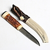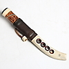 Schaft aus Horn und Mauserbirke mit Elementen aus Silber. Messerklinge gemarkt "Frosts Mora - Made in Sweden, Laminated Steel", Länge 10,8 cm. Durchbrochene Scheide aus Leder und Horn, gemarkt LJ. Gesamtlänge 24,5 cm.
