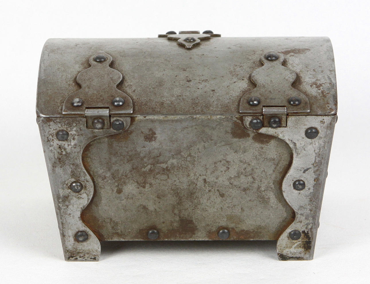 kleine Metalltruhe genietet, gewölbter Deckel mit Scharnier und Schließblech, Schloss nicht vorhanden, Maße 13 x 9 cm, Höhe 9 cm.