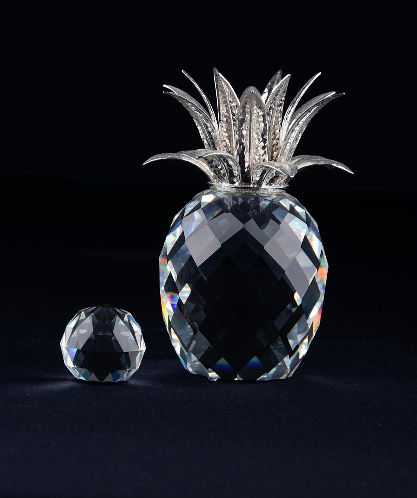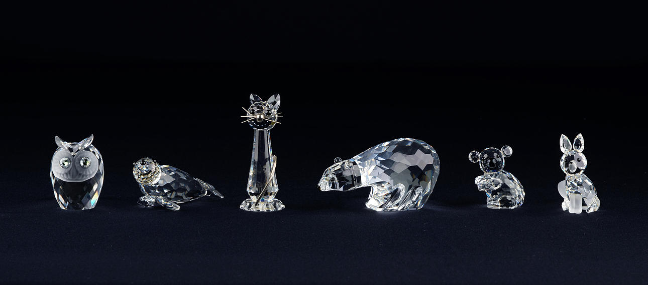 Swarovski Ananas, Bär, Robbe, Eule, Koala, Katze, Hund und facettierte Kugel. Datierung wohl 1980/90er Jahre (Ananas aus 1988). Höhe von 3 bis 11 cm.