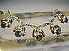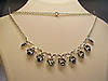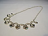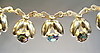 Das Mittelteil ist aus 9 blüten/blattförmigen Teilen gearbeitet von denen 7 rund facettierte Rheinkiesel in feiner Irisierung tragen. Es ist an eine Ösenkette mit