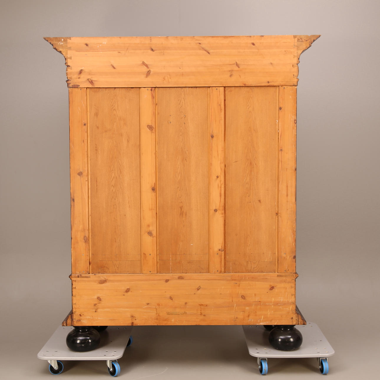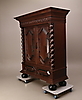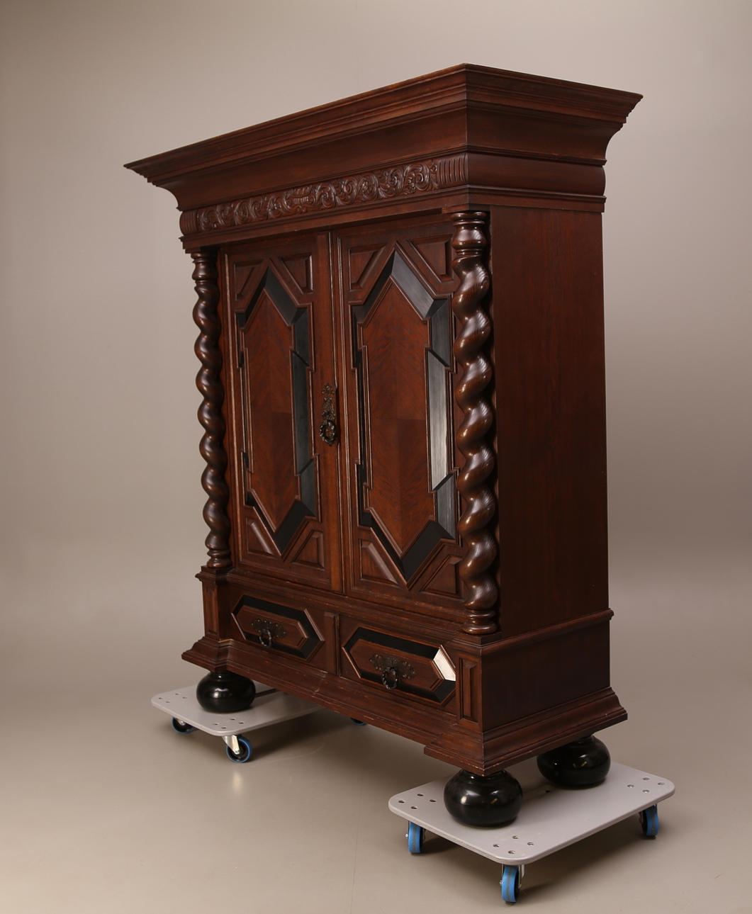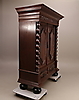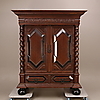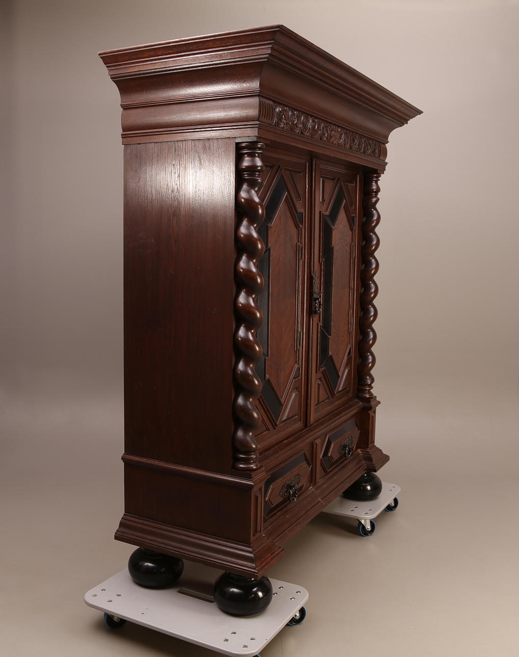Paar Türen und zwei Schubladen, schmiedeeiserne Beschläge, innen vier Einlegeböden und zwei Schubladen. Ein Schlüssel. Geschraubte Säulen.