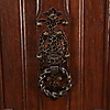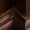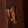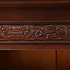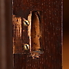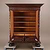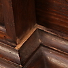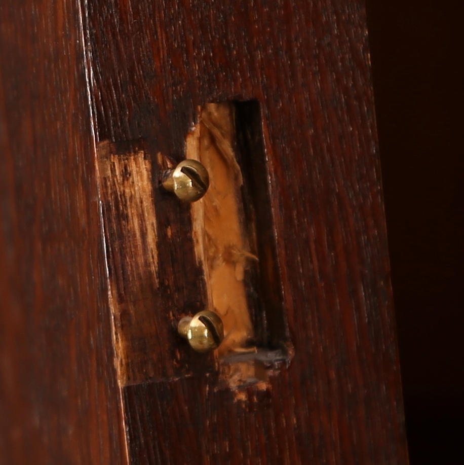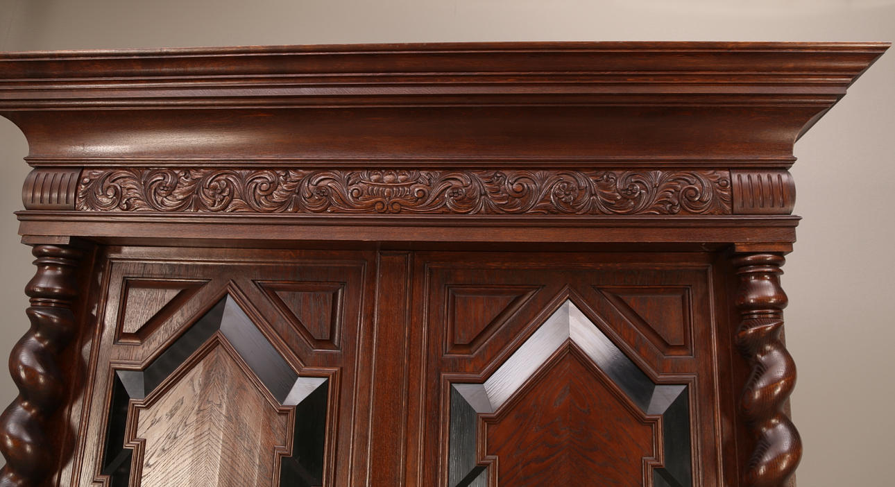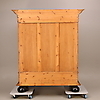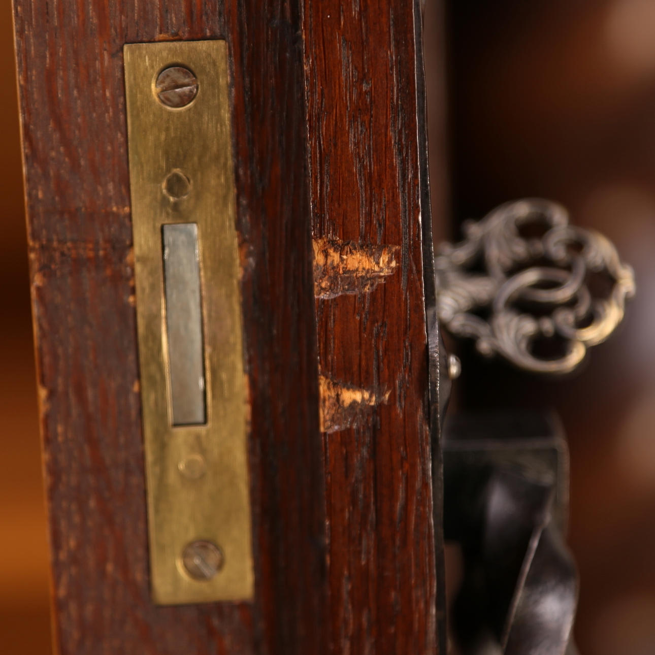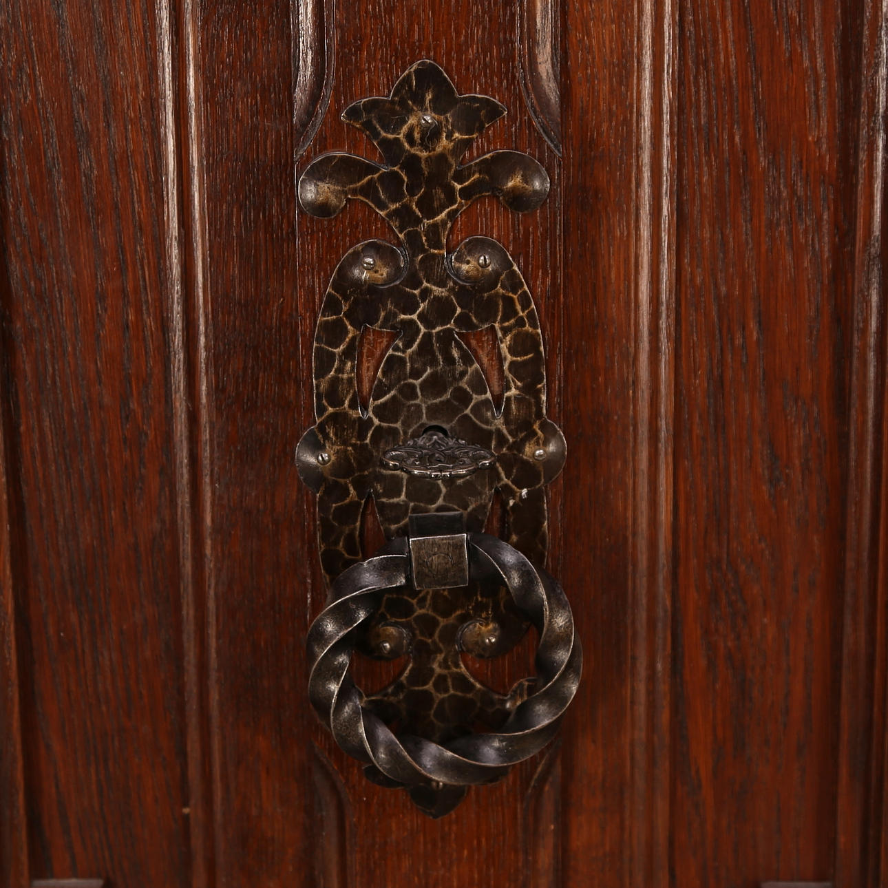 Paar Türen und zwei Schubladen, schmiedeeiserne Beschläge, innen vier Einlegeböden und zwei Schubladen. Ein Schlüssel. Geschraubte Säulen.