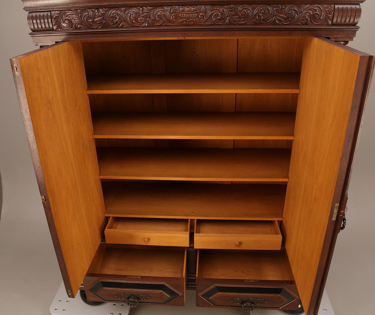 Der Schrank in fünf Teilen: Unterteil mit Schubladen + zwei Türen + Oberteil mit Regalen + Krone.