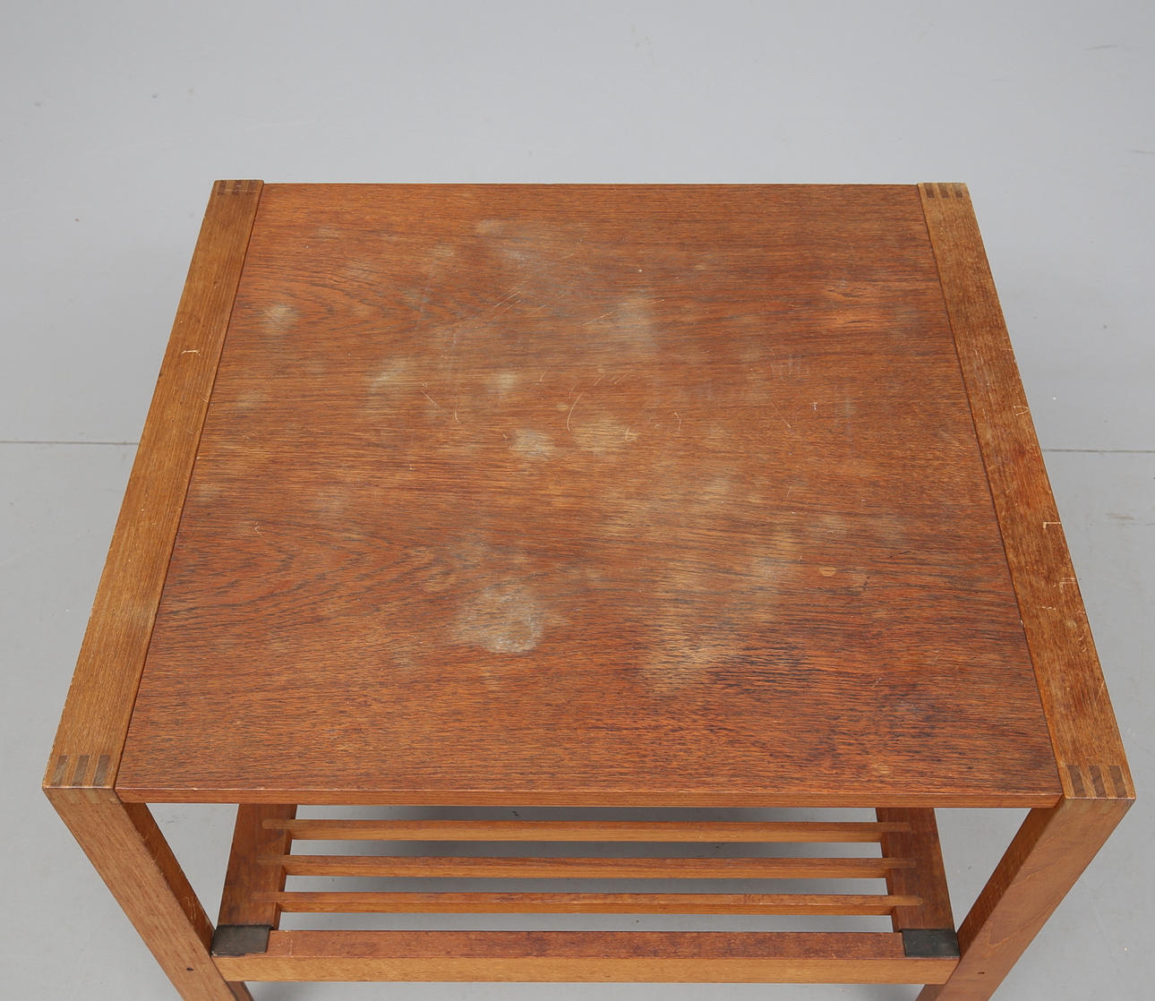 Teak. Darunter liegendes Zeitungsregal. Länge 58. Breite 66. Höhe 52 cm.