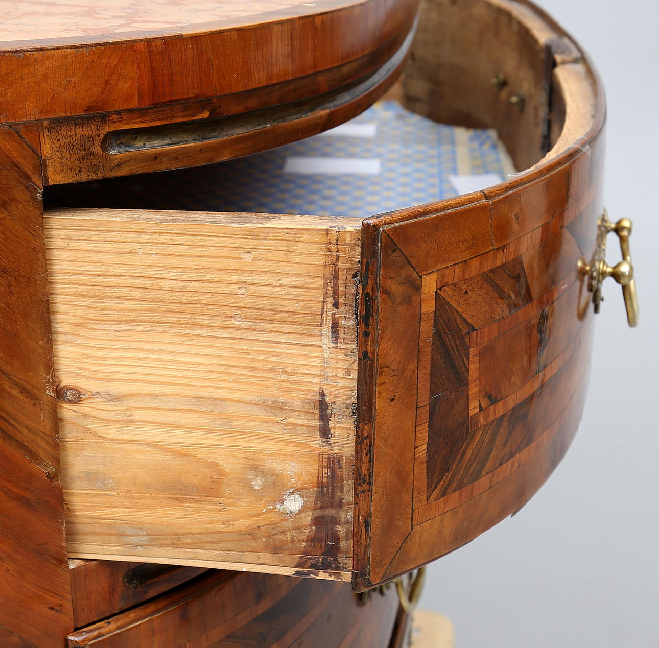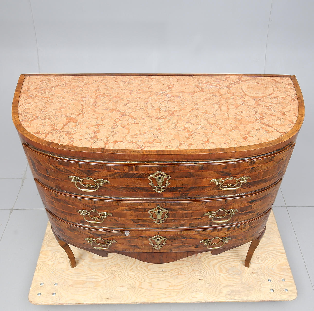 Furniert mit verschiedenen Holzarten. Messingbeschläge. Marmorplatte. Drei Schubladen. Länge 129. Breite 59. Höhe 100 cm.