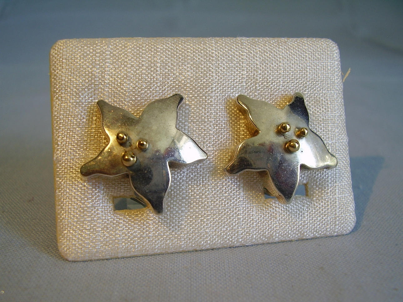 Die Ohrringe sind gearbeitet in Form von stilisierten Seesternen mit drei goldenen Granulaten im Zentrum.