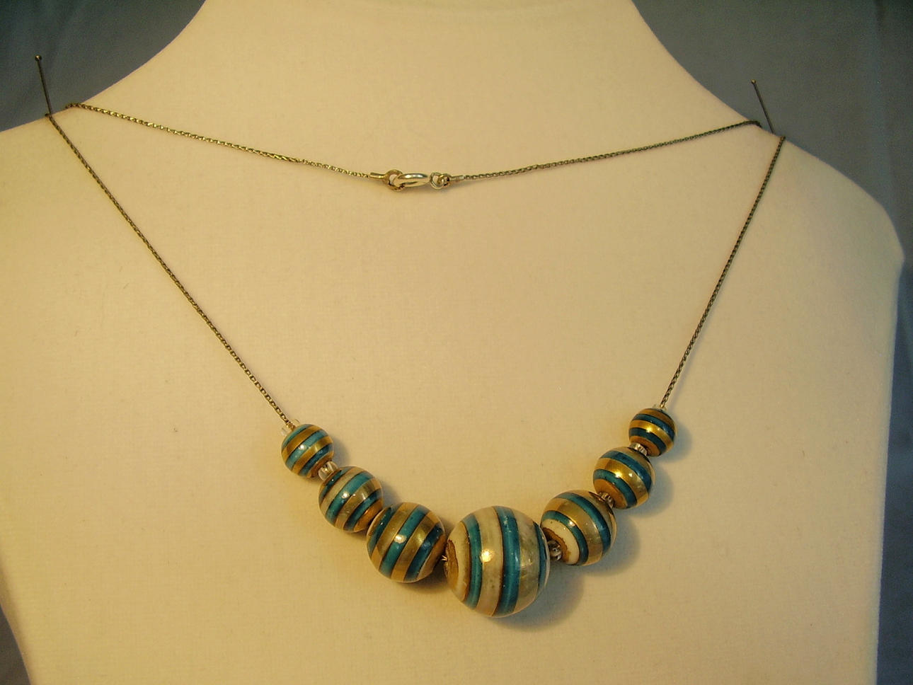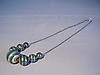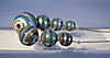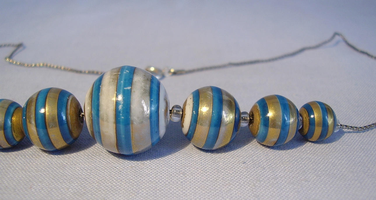 Collier mit WMF-typischer versilberter Zopfkette mit sekundärem Federring-Verschluß in Silber und sieben farbig ausgeführten Keramik Kugeln in unterschiedlicher Größe.