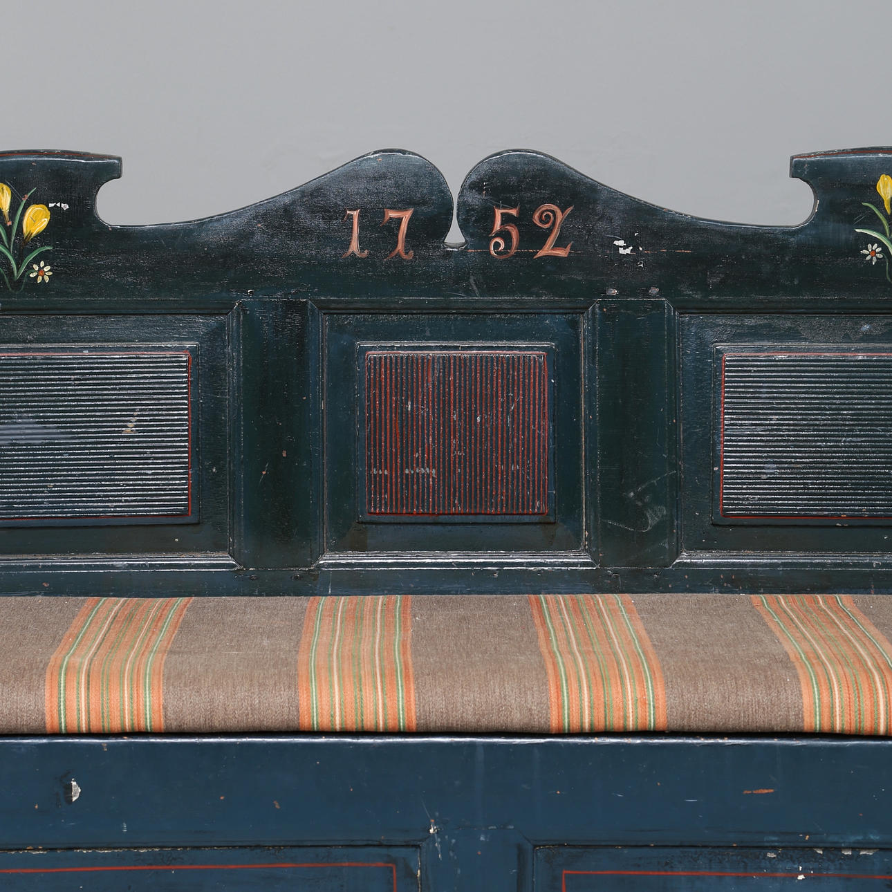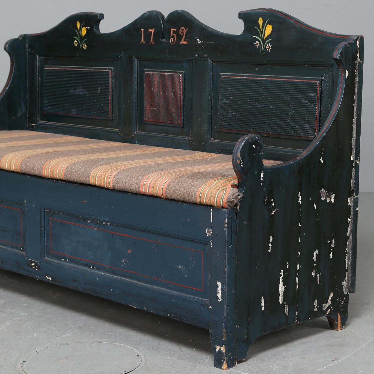 Der Sitz ist mit gestreiftem Wollstoff bezogen. Stauraum unter dem Sitz.