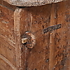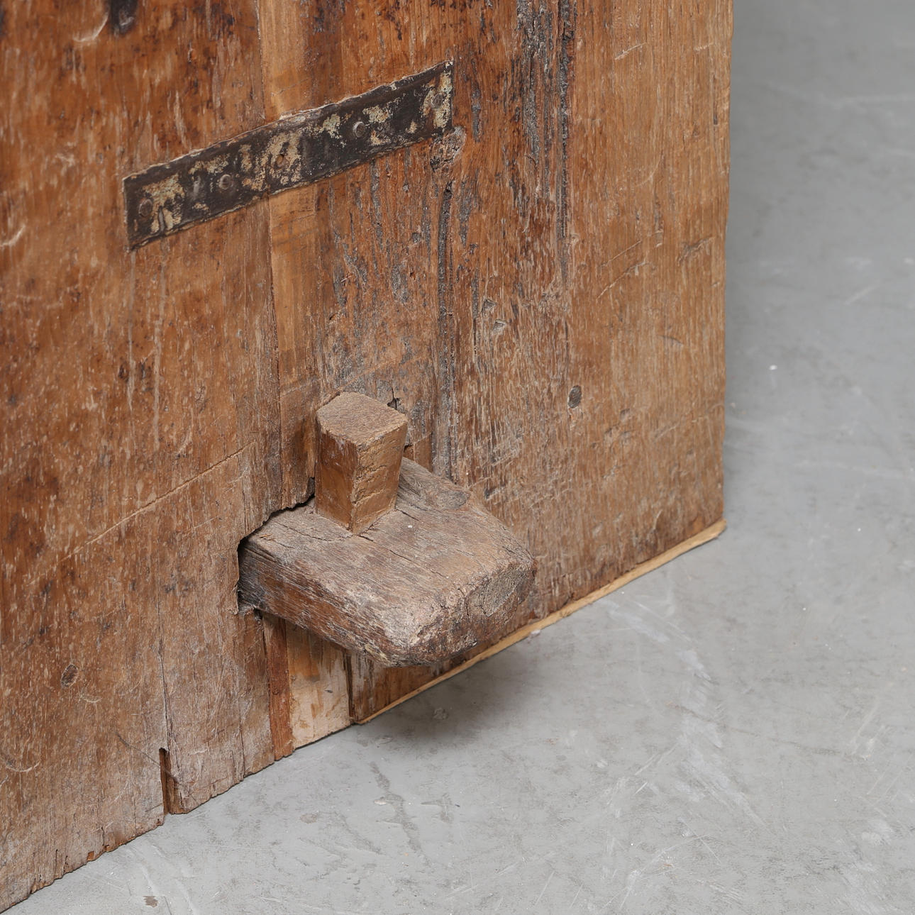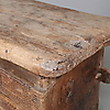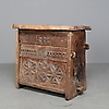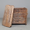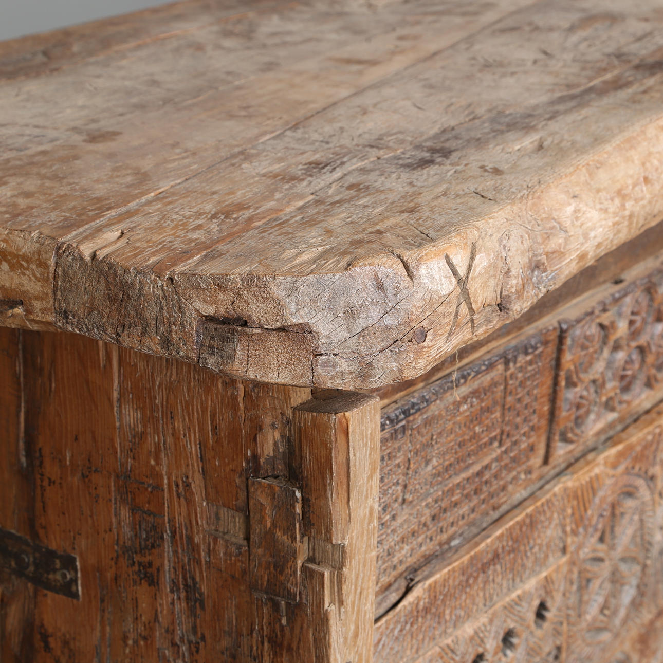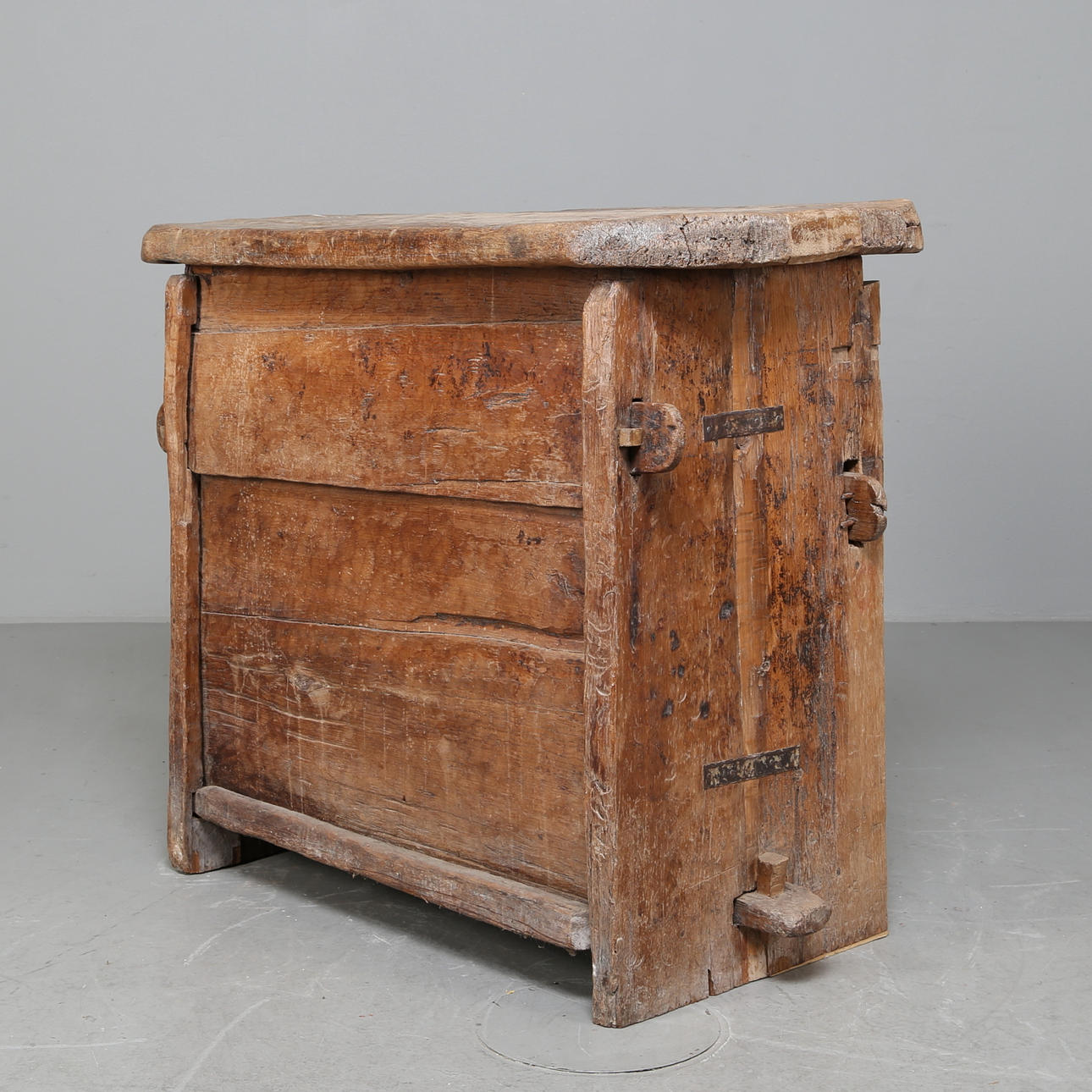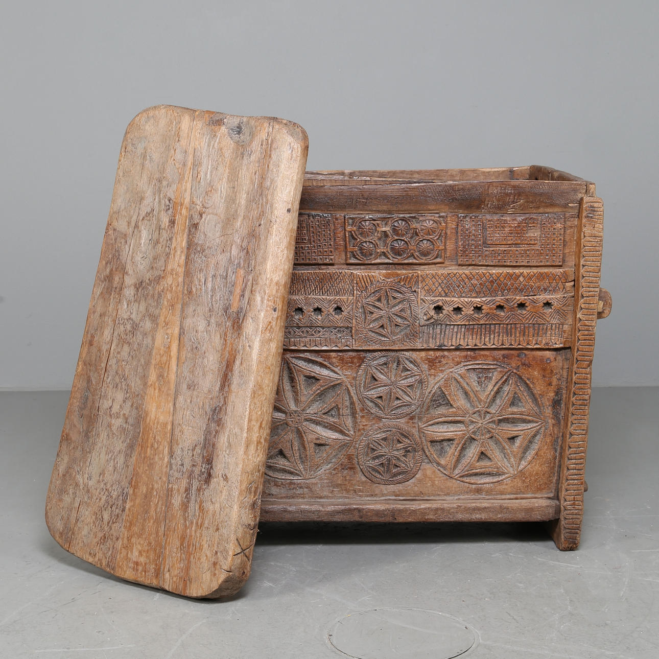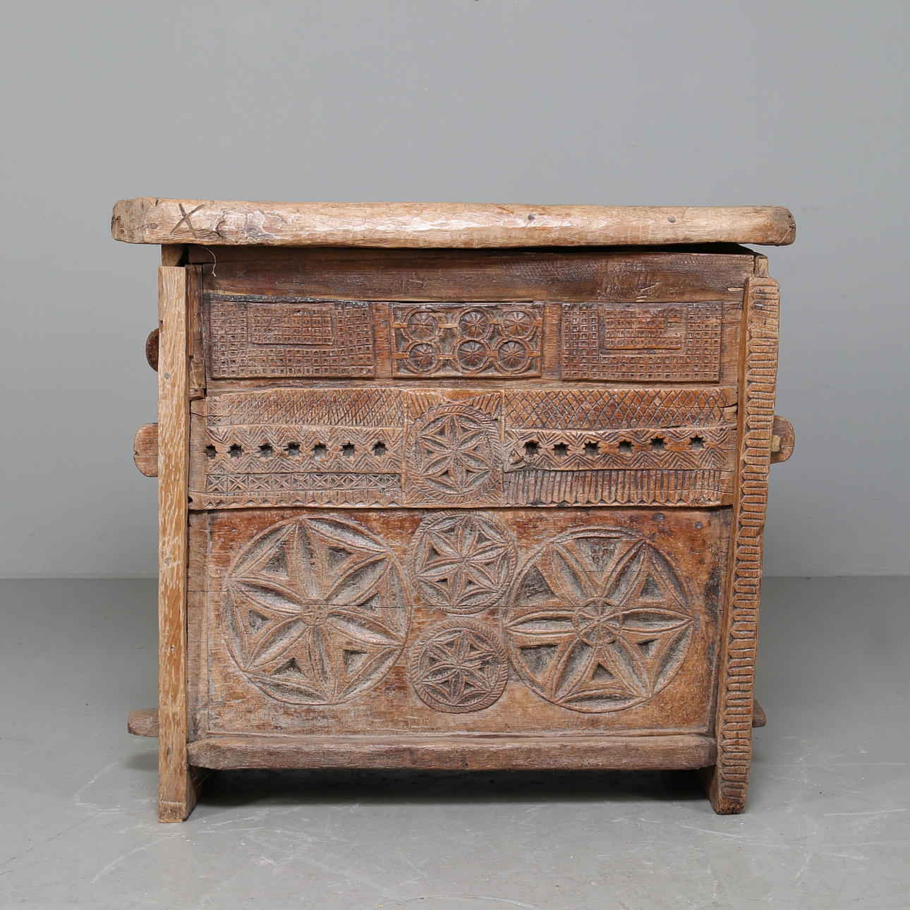 Die Vorderseite ist reich mit eingeritzten Schnitzereien verziert, die Seitenteile und der Boden mit durchgehenden Nieten befestigt.