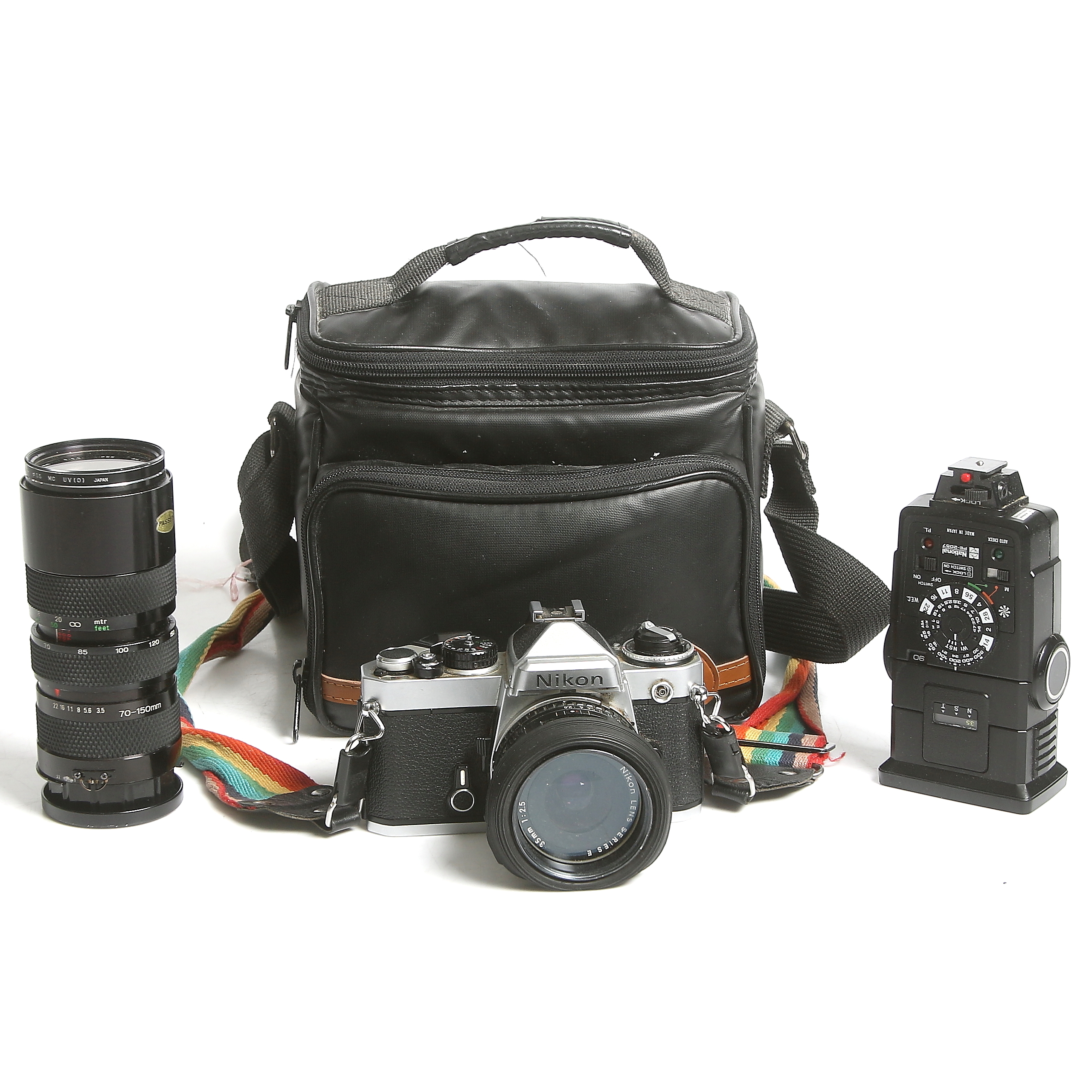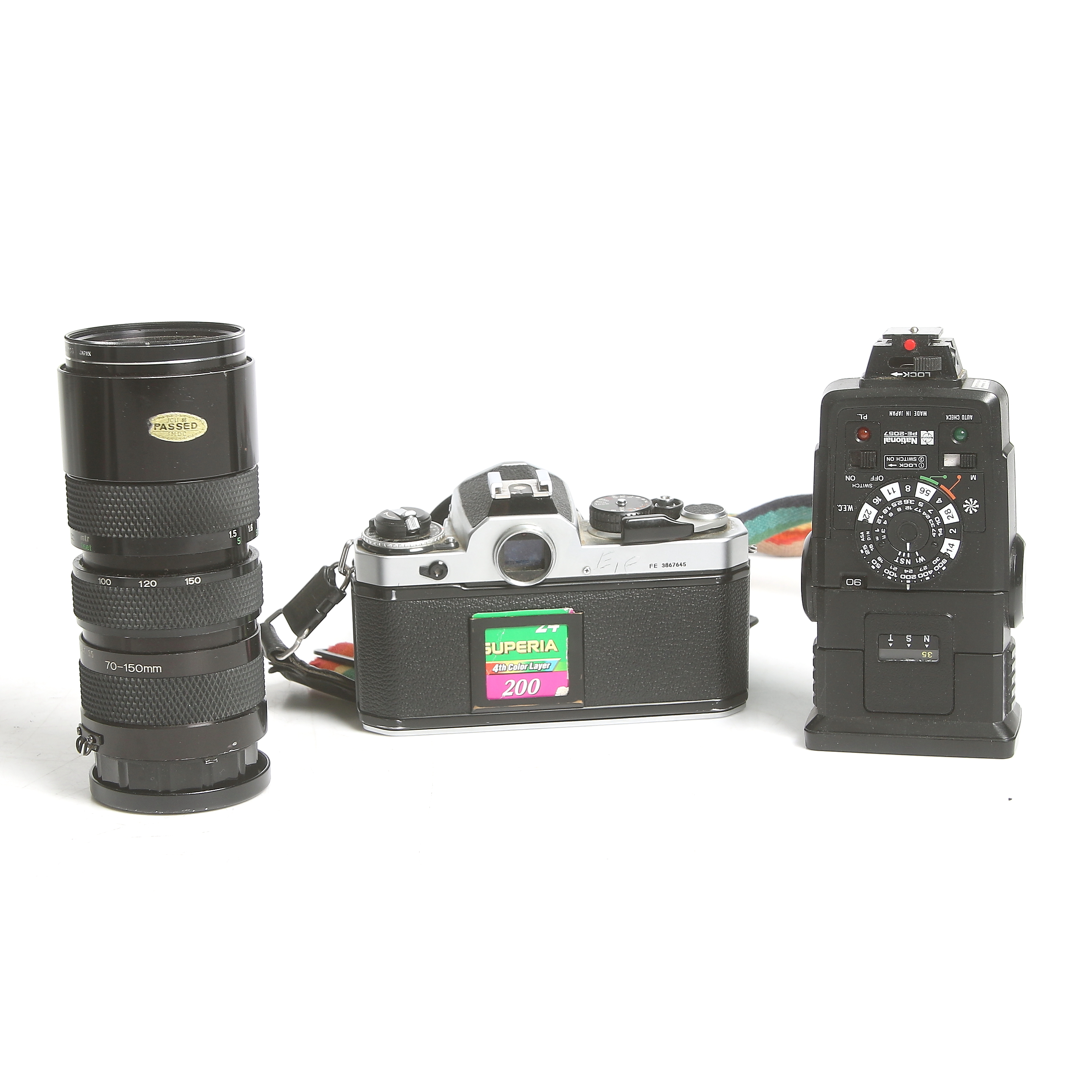 648393. KAMERA, Nikon FE, analog, Teleobjektiv und Blitz.