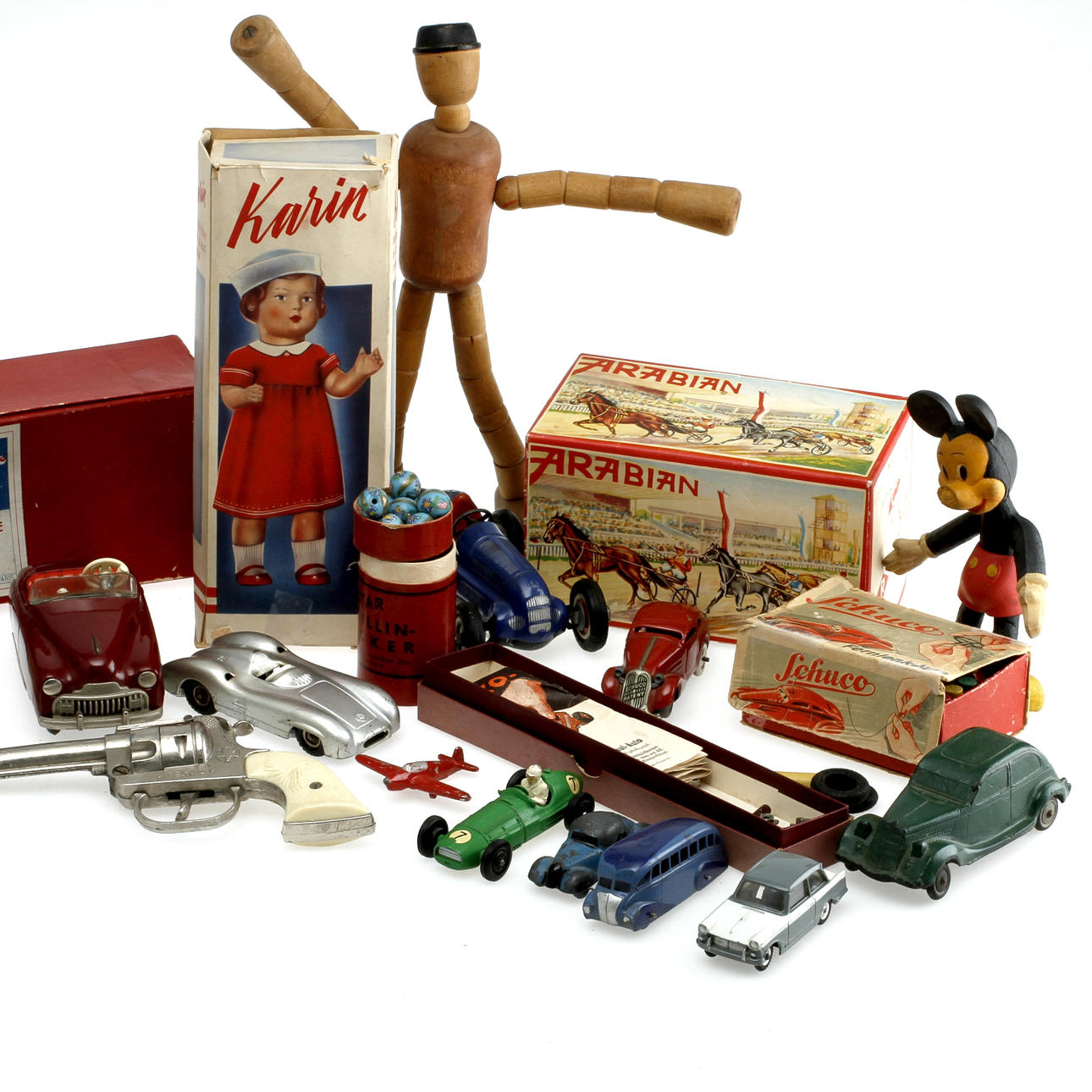 Darunter 3 Schuco Autos, 1 Schuco Fernlenk-Auto, Teddybären, Traberpferd etc.